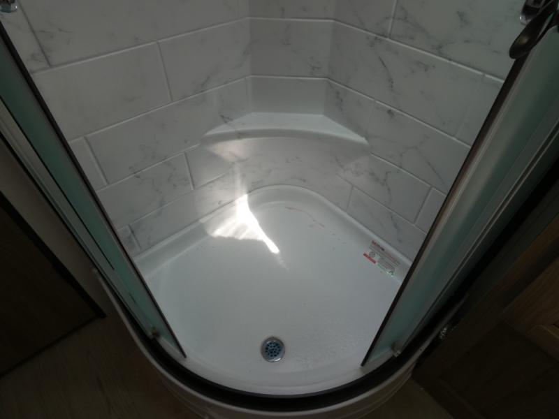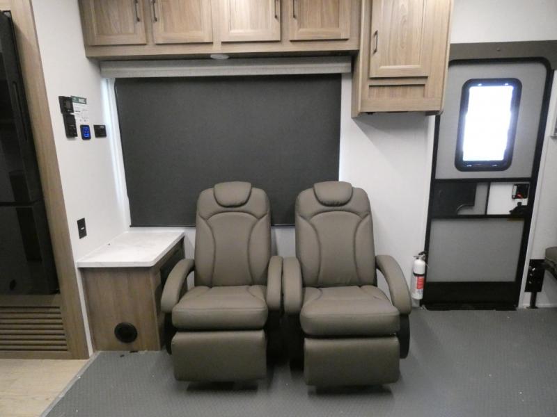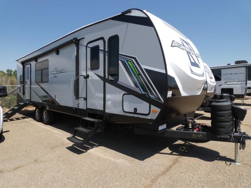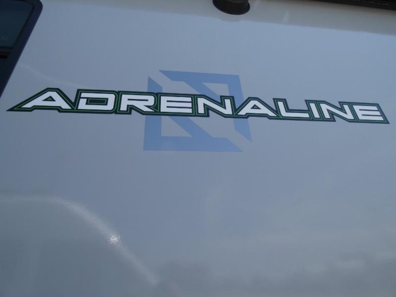 With any Adrenaline toy hauler travel trailer by Coachmen, the required Exterior Value package includes a one-piece Tufflex PVC roof membrane, a fiberglass front cap with rock guard to help against road debris, heavy duty Dexter axles with Nev-R-Adjust brakes and E-Z Lube, and aluminum wheels. Some exterior standards include a heated and enclosed underbelly, a patio ready ramp door with cables for an outdoor above ground space to enjoy, a power tongue jack for easy setup, and an outside spray port to clean off your toys. The interior standards include HD rubberized oil/gas/moisture resistant flooring in the garage area, hidden hinge cabinets and doors, a rear detachable screen, and USB charging ports in multiple locations for your electronics to mention a few.