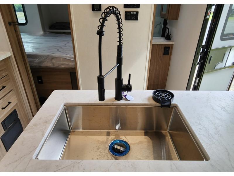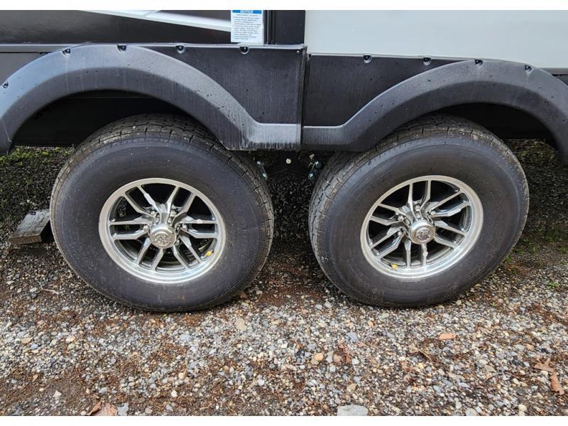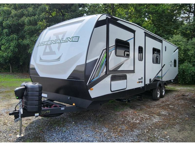With any Adrenaline toy hauler travel trailer by Coachmen, the required Exterior Value package includes a one-piece Tufflex PVC roof membrane, a fiberglass front cap with rock guard to help against road debris, heavy duty Dexter axles with Nev-R-Adjust brakes and E-Z Lube, and aluminum wheels. Some exterior standards include a heated and enclosed underbelly, a patio ready ramp door with cables for an outdoor above ground space to enjoy, a power tongue jack for easy setup, and an outside spray port to clean off your toys. The interior standards include HD rubberized oil/gas/moisture resistant flooring in the garage area, hidden hinge cabinets and doors, a rear detachable screen, and USB charging ports in multiple locations for your electronics to mention a few.