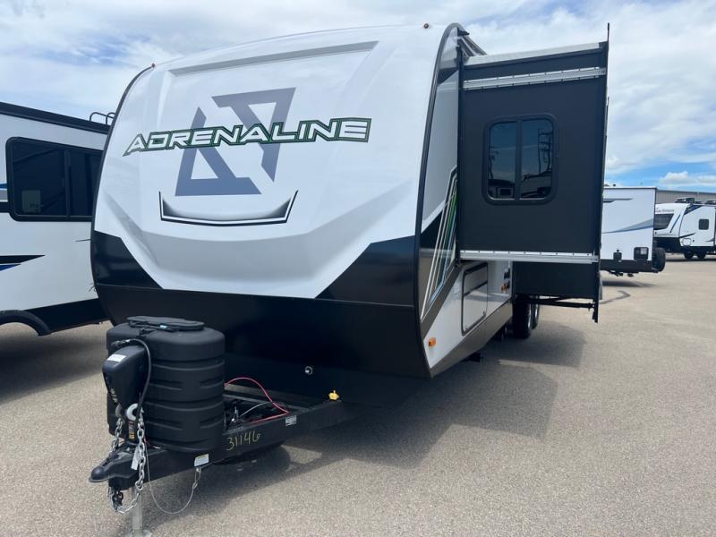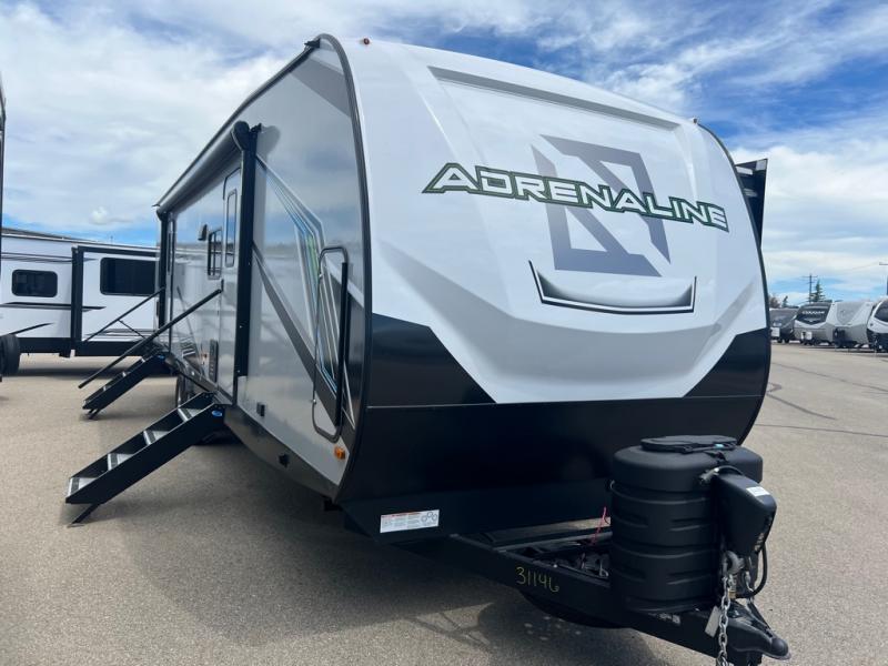 With any Adrenaline toy hauler travel trailer by Coachmen, the required Exterior Value package includes a one-piece Tufflex PVC roof membrane, a fiberglass front cap with rock guard to help against road debris, heavy duty Dexter axles with Nev-R-Adjust brakes and E-Z Lube, and aluminum wheels. Some exterior standards include a heated and enclosed underbelly, a patio ready ramp door with cables for an outdoor above ground space to enjoy, a power tongue jack for easy setup, and an outside spray port to clean off your toys. The interior standards include HD rubberized oil/gas/moisture resistant flooring in the garage area, hidden hinge cabinets and doors, a rear detachable screen, and USB charging ports in multiple locations for your electronics to mention a few.