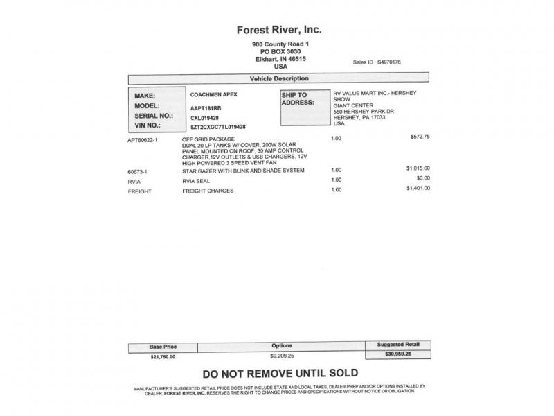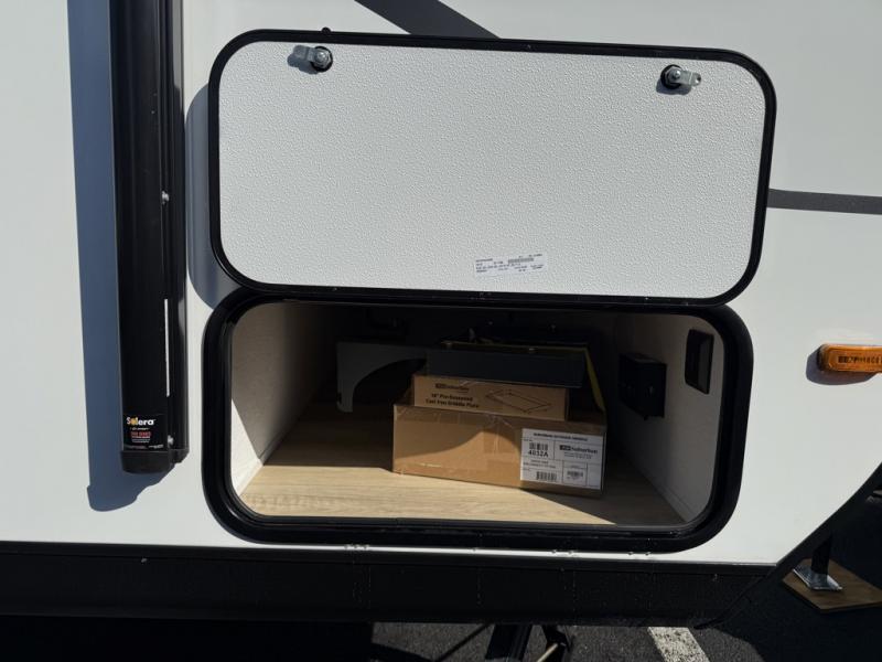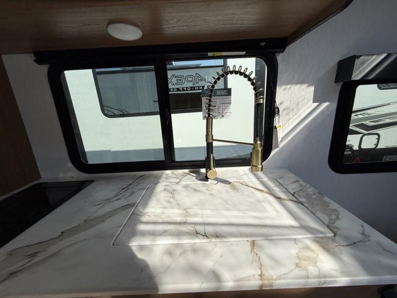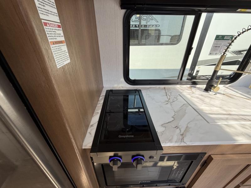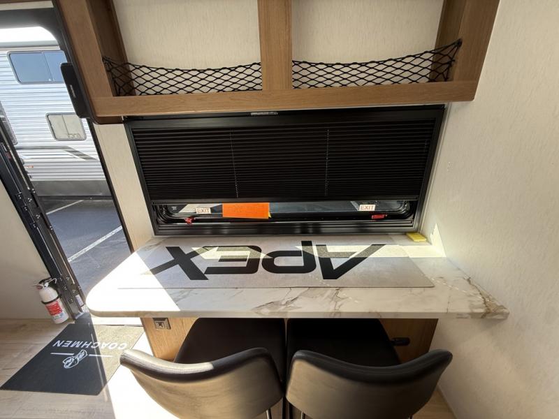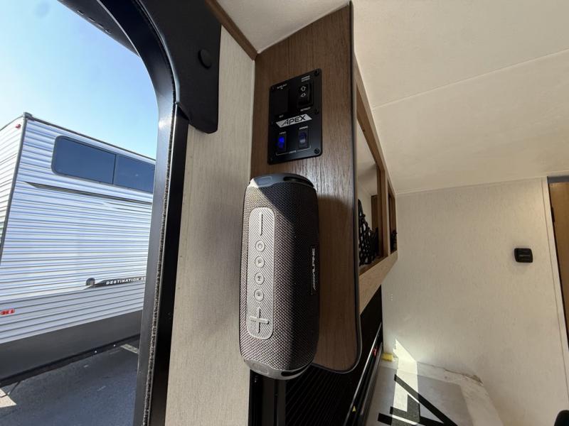 You will find comfort, convenience, and a sturdy construction with each of these Coachmen RV Apex Nano travel trailers! They are held together with an aluma-cage construction, an I-beam chassis, plus vacuum-bonded laminated dual Azdel fiberglass walls for double the protection against the elements. The 400-watt solar panel with a 30 amp control charger is included, along with two 20 lb. LP tanks, a high velocity power roof vent, plus 12V outlets to keep you powered up. More exterior features include a hot/cold shower, four stabilizer jacks, a power awning with LED lighting, and radius thumb latch baggage doors to easily pack and unload your gear. You will love the interior of your Apex Nano with Congoleum residential flooring, one-piece seamless edge countertops, matte black hardware in the galley, and a hand-crafted wood medicine cabinet in the bath.