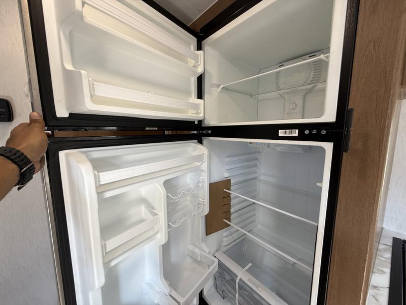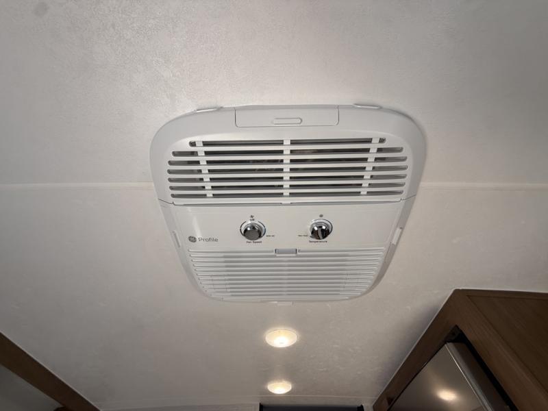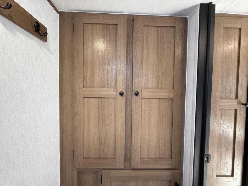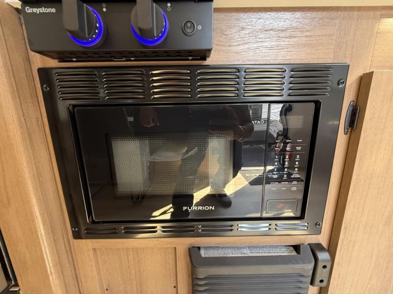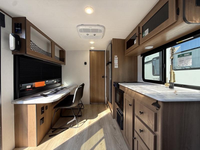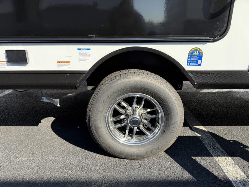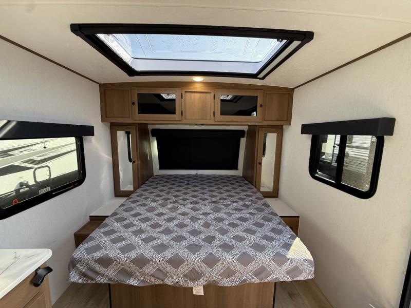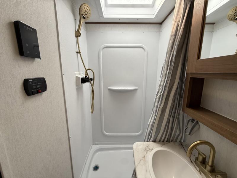 As you step inside this well-designed trailer, you'll first discover the front bedroom, complete with a cozy queen bed for a restful night’s sleep and dual wardrobes on either side to keep your clothing and essentials neatly organized. Moving into the center of the trailer, the kitchen is equipped with everything you need, including a pantry, 12V refrigerator, 2-burner cooktop, and even an air fryer microwave, making meal prep quick and convenient. Just across from the kitchen, a bar counter with chairs offers a comfortable spot to dine, relax, or enjoy conversation. At the rear, the full bathroom provides the convenience of home, featuring a shower/tub surround, a skylight for natural light, and a foot flush toilet. For added versatility, there's also an exterior hot and cold shower, perfect for rinsing off after a day outdoors.