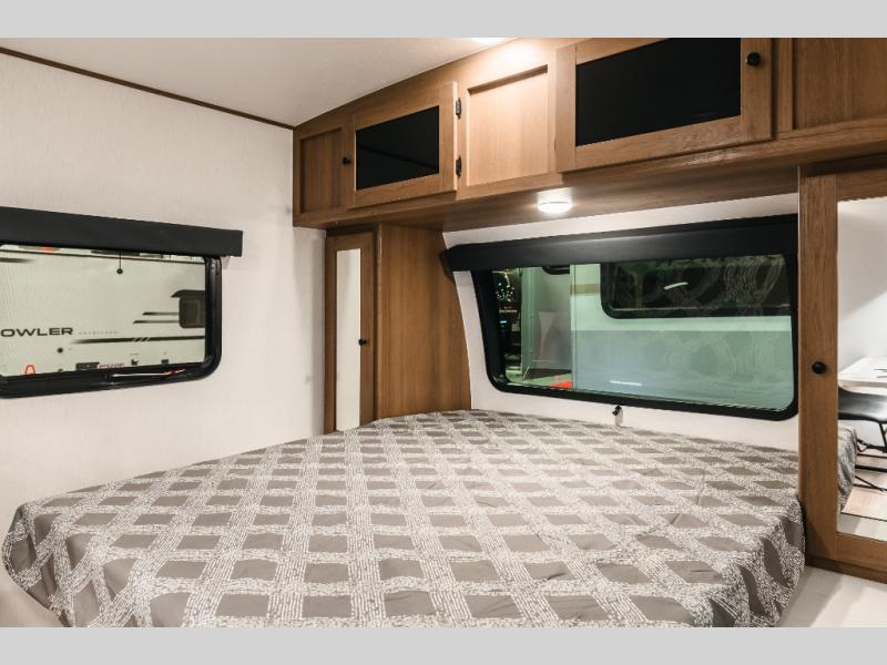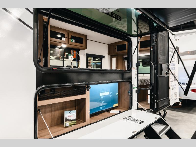 As you step inside this well-designed trailer, you'll first discover the front bedroom, complete with a cozy queen bed for a restful night’s sleep and dual wardrobes on either side to keep your clothing and essentials neatly organized. Moving into the center of the trailer, the kitchen is equipped with everything you need, including a pantry, 12V refrigerator, 2-burner cooktop, and even an air fryer microwave, making meal prep quick and convenient. Just across from the kitchen, a bar counter with chairs offers a comfortable spot to dine, relax, or enjoy conversation. At the rear, the full bathroom provides the convenience of home, featuring a shower/tub surround, a skylight for natural light, and a foot flush toilet. For added versatility, there's also an exterior hot and cold shower, perfect for rinsing off after a day outdoors.