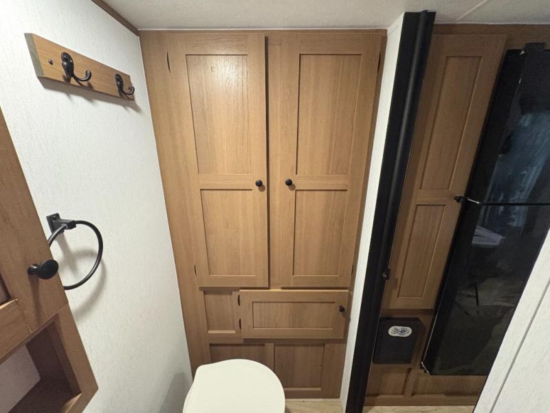 As you step inside this well-designed trailer, you'll first discover the front bedroom, complete with a cozy queen bed for a restful night’s sleep and dual wardrobes on either side to keep your clothing and essentials neatly organized. Moving into the center of the trailer, the kitchen is equipped with everything you need, including a pantry, 12V refrigerator, 2-burner cooktop, and even an air fryer microwave, making meal prep quick and convenient. Just across from the kitchen, a bar counter with chairs offers a comfortable spot to dine, relax, or enjoy conversation. At the rear, the full bathroom provides the convenience of home, featuring a shower/tub surround, a skylight for natural light, and a foot flush toilet. For added versatility, there's also an exterior hot and cold shower, perfect for rinsing off after a day outdoors.