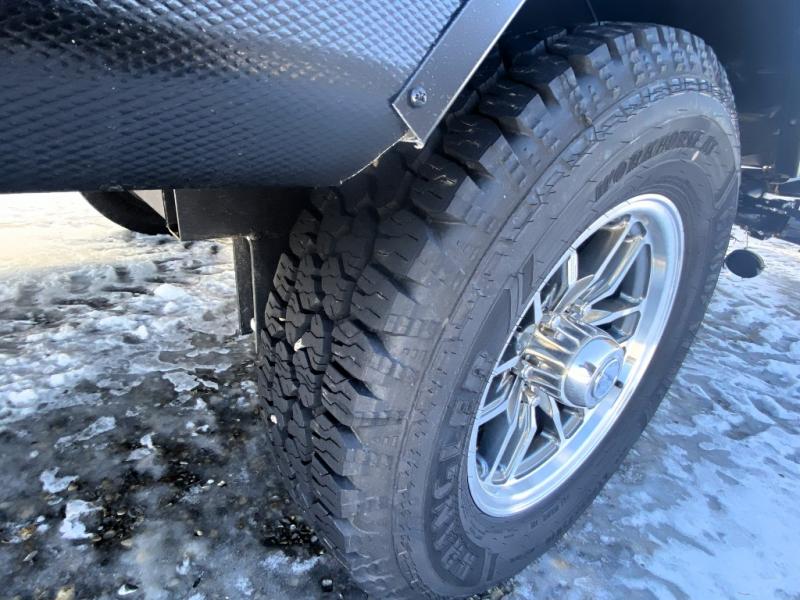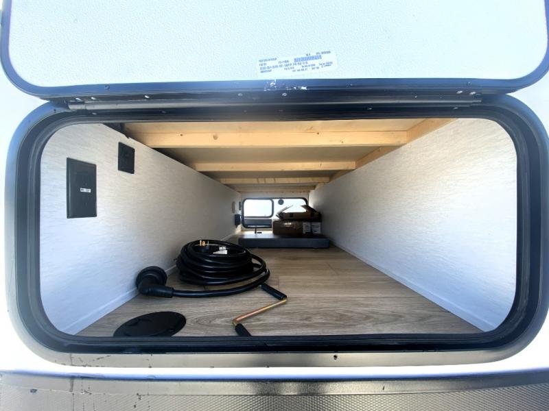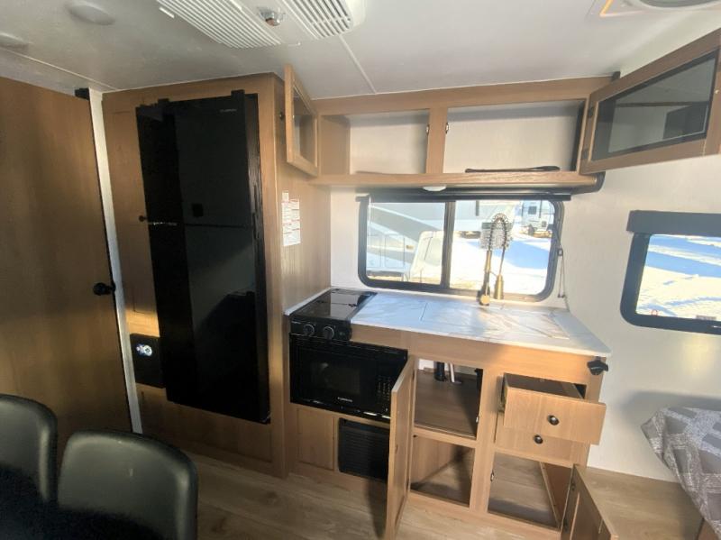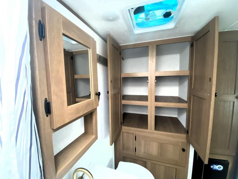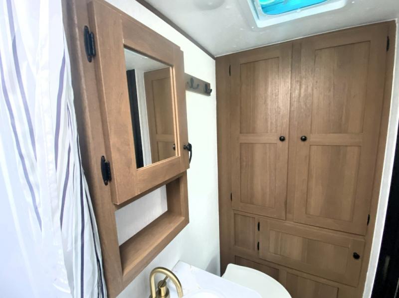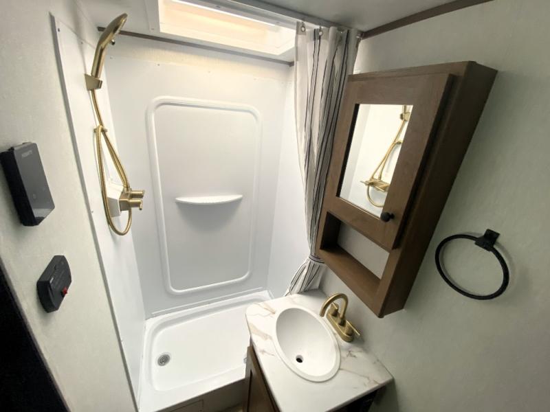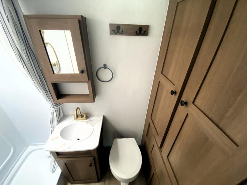 As you step inside this well-designed trailer, you'll first discover the front bedroom, complete with a cozy queen bed for a restful night’s sleep and dual wardrobes on either side to keep your clothing and essentials neatly organized. Moving into the center of the trailer, the kitchen is equipped with everything you need, including a pantry, 12V refrigerator, 2-burner cooktop, and even an air fryer microwave, making meal prep quick and convenient. Just across from the kitchen, a bar counter with chairs offers a comfortable spot to dine, relax, or enjoy conversation. At the rear, the full bathroom provides the convenience of home, featuring a shower/tub surround, a skylight for natural light, and a foot flush toilet. For added versatility, there's also an exterior hot and cold shower, perfect for rinsing off after a day outdoors.