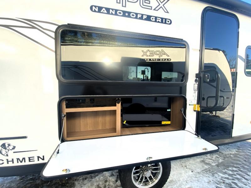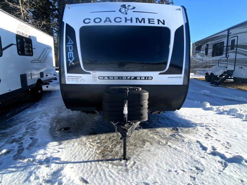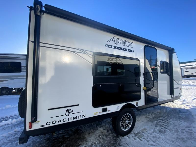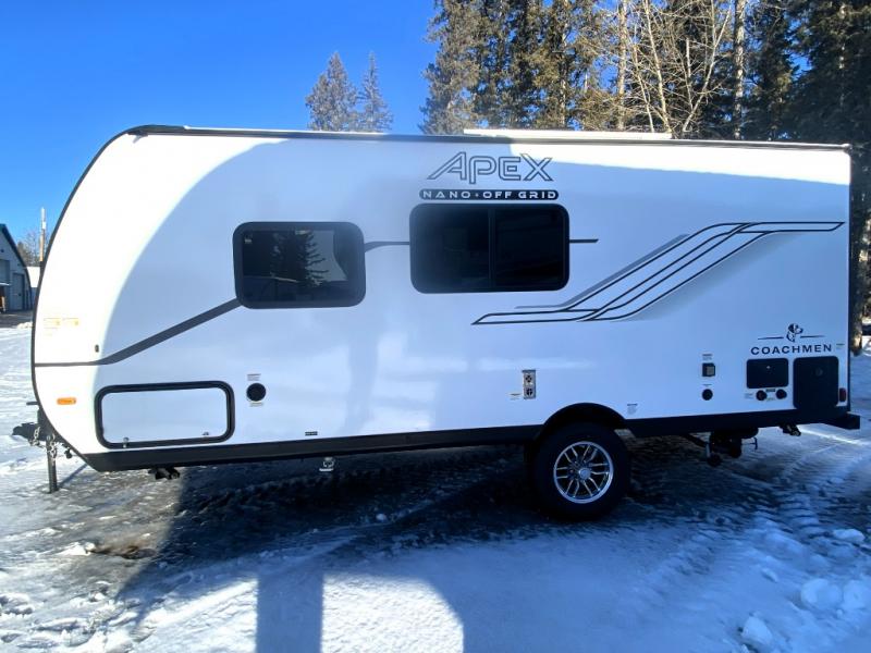 You will find comfort, convenience, and a sturdy construction with each of these Coachmen RV Apex Nano travel trailers! They are held together with an aluma-cage construction, an I-beam chassis, plus vacuum-bonded laminated dual Azdel fiberglass walls for double the protection against the elements. The 400-watt solar panel with a 30 amp control charger is included, along with two 20 lb. LP tanks, a high velocity power roof vent, plus 12V outlets to keep you powered up. More exterior features include a hot/cold shower, four stabilizer jacks, a power awning with LED lighting, and radius thumb latch baggage doors to easily pack and unload your gear. You will love the interior of your Apex Nano with Congoleum residential flooring, one-piece seamless edge countertops, matte black hardware in the galley, and a hand-crafted wood medicine cabinet in the bath.