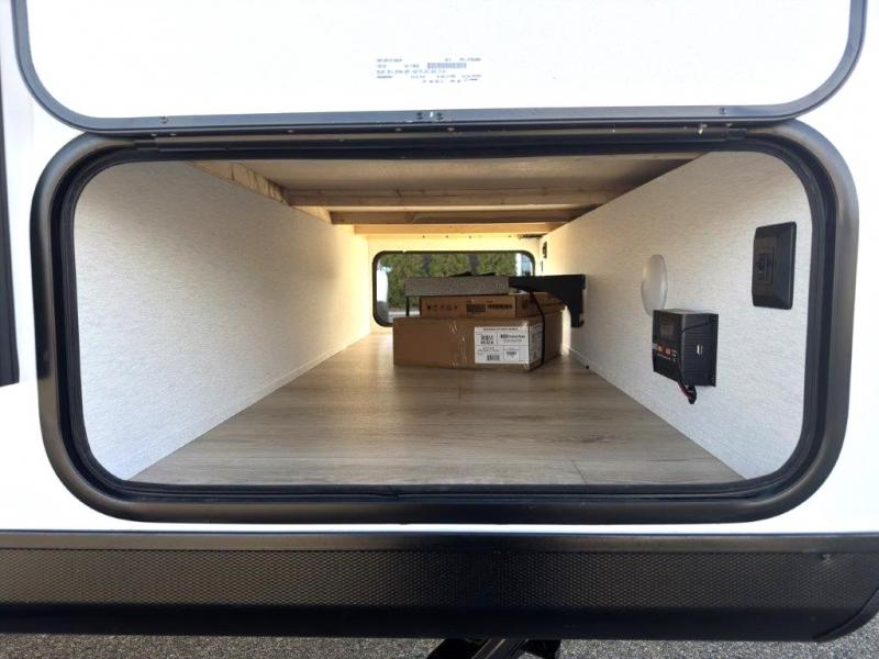 As you step inside this well-designed trailer, you'll first discover the front bedroom, complete with a cozy queen bed for a restful night’s sleep and dual wardrobes on either side to keep your clothing and essentials neatly organized. Moving into the center of the trailer, the kitchen is equipped with everything you need, including a pantry, 12V refrigerator, 2-burner cooktop, and even an air fryer microwave, making meal prep quick and convenient. Just across from the kitchen, a bar counter with chairs offers a comfortable spot to dine, relax, or enjoy conversation. At the rear, the full bathroom provides the convenience of home, featuring a shower/tub surround, a skylight for natural light, and a foot flush toilet. For added versatility, there's also an exterior hot and cold shower, perfect for rinsing off after a day outdoors.
