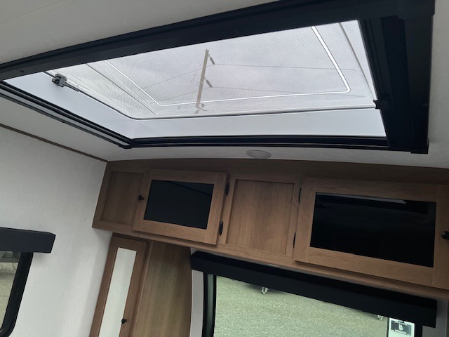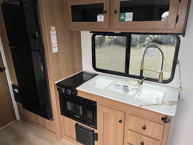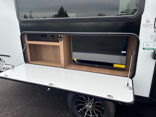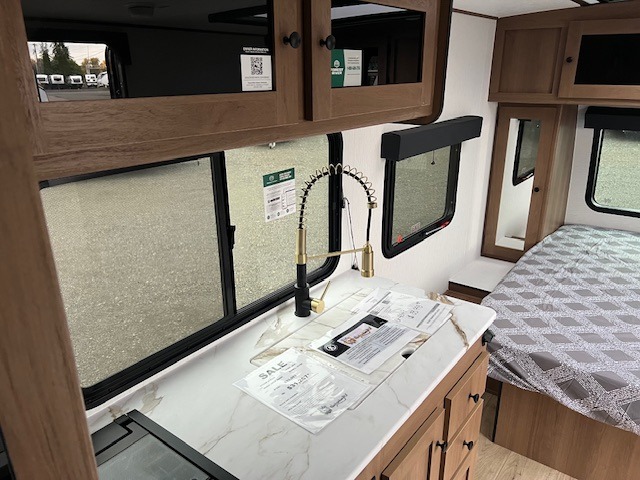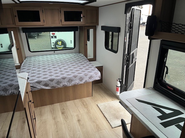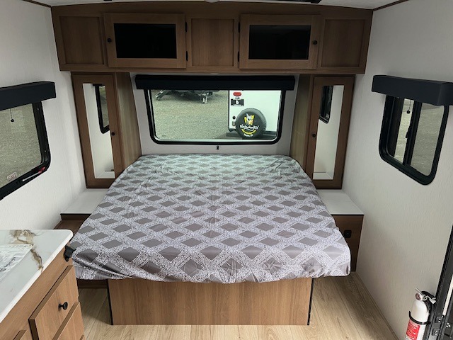 As you step inside this well-designed trailer, you'll first discover the front bedroom, complete with a cozy queen bed for a restful night’s sleep and dual wardrobes on either side to keep your clothing and essentials neatly organized. Moving into the center of the trailer, the kitchen is equipped with everything you need, including a pantry, 12V refrigerator, 2-burner cooktop, and even an air fryer microwave, making meal prep quick and convenient. Just across from the kitchen, a bar counter with chairs offers a comfortable spot to dine, relax, or enjoy conversation. At the rear, the full bathroom provides the convenience of home, featuring a shower/tub surround, a skylight for natural light, and a foot flush toilet. For added versatility, there's also an exterior hot and cold shower, perfect for rinsing off after a day outdoors.