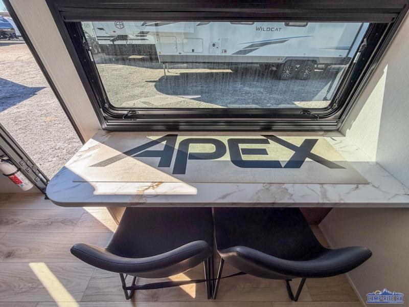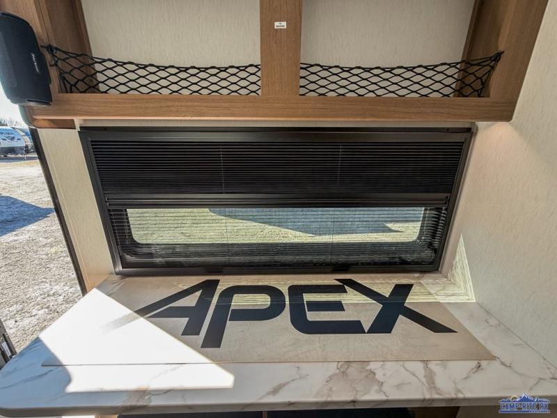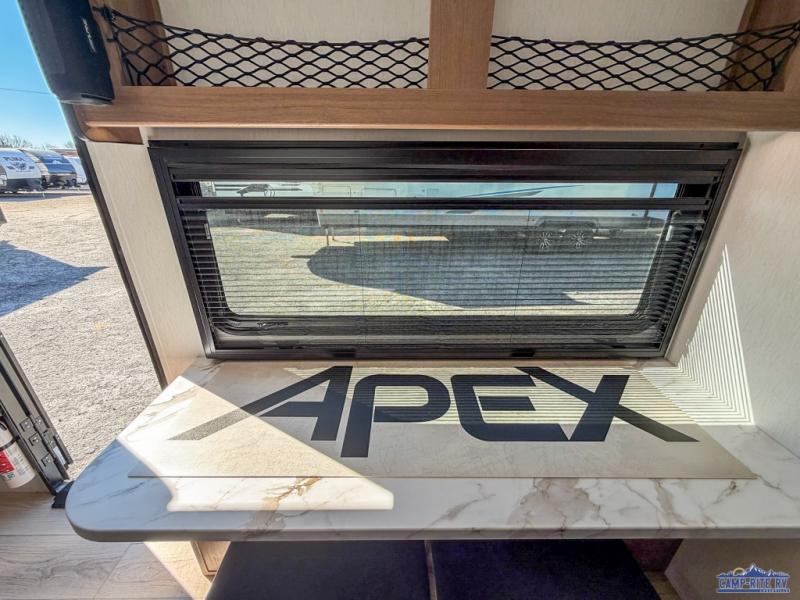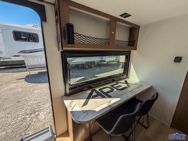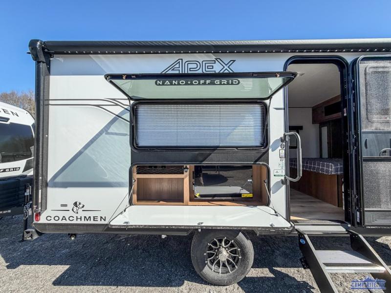 You will find comfort, convenience, and a sturdy construction with each of these Coachmen RV Apex Nano travel trailers! They are held together with an aluma-cage construction, an I-beam chassis, plus vacuum-bonded laminated dual Azdel fiberglass walls for double the protection against the elements. The 400-watt solar panel with a 30 amp control charger is included, along with two 20 lb. LP tanks, a high velocity power roof vent, plus 12V outlets to keep you powered up. More exterior features include a hot/cold shower, four stabilizer jacks, a power awning with LED lighting, and radius thumb latch baggage doors to easily pack and unload your gear. You will love the interior of your Apex Nano with Congoleum residential flooring, one-piece seamless edge countertops, matte black hardware in the galley, and a hand-crafted wood medicine cabinet in the bath.