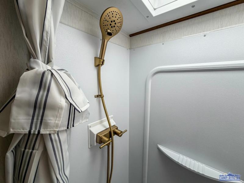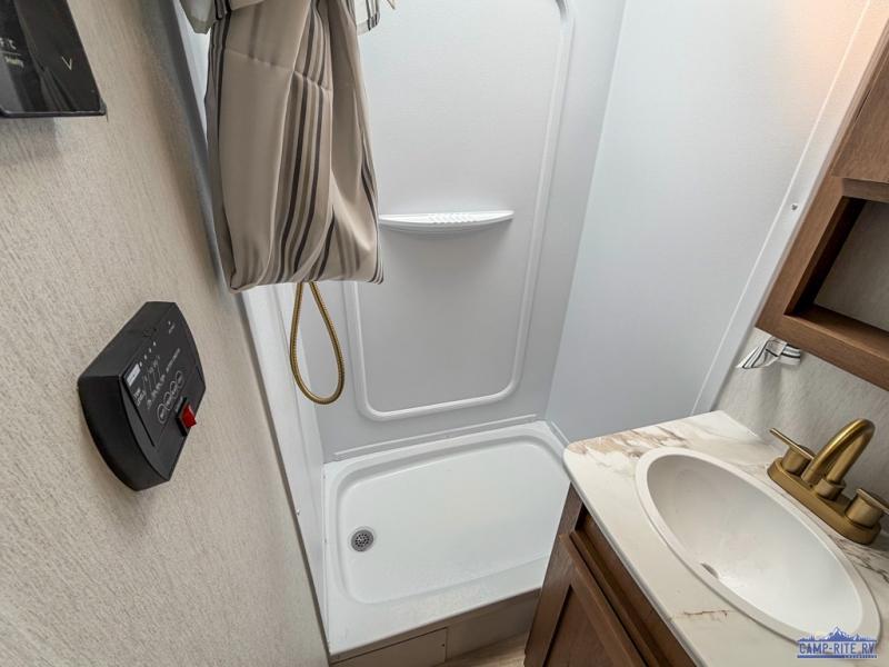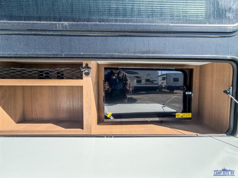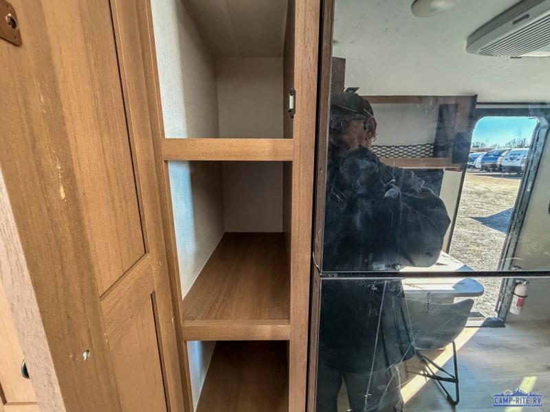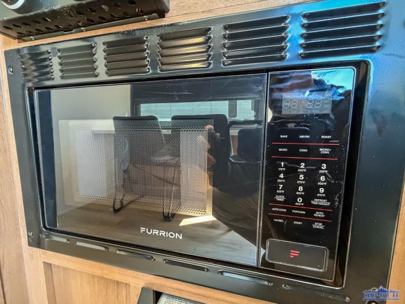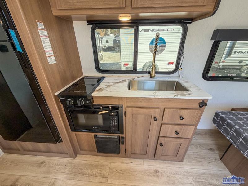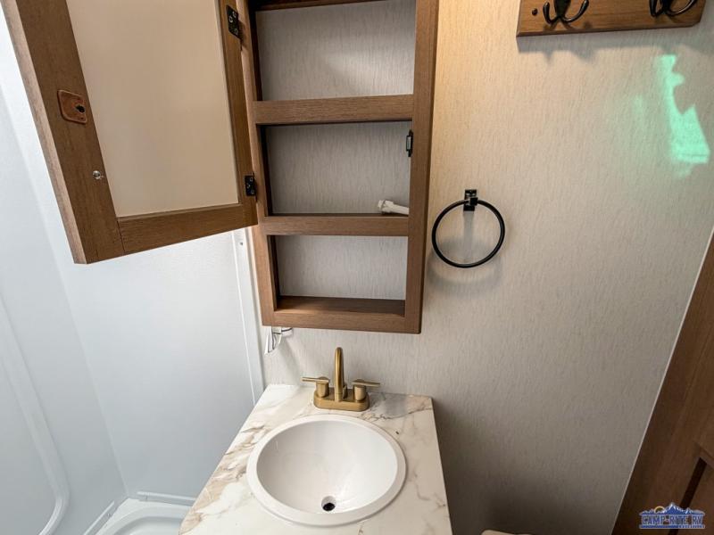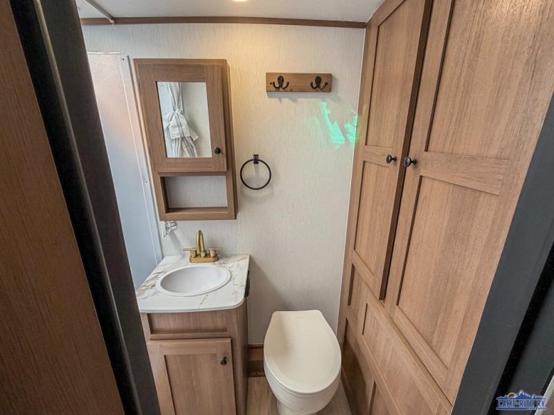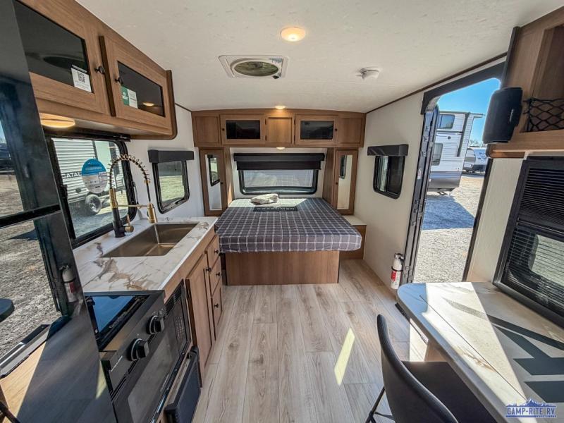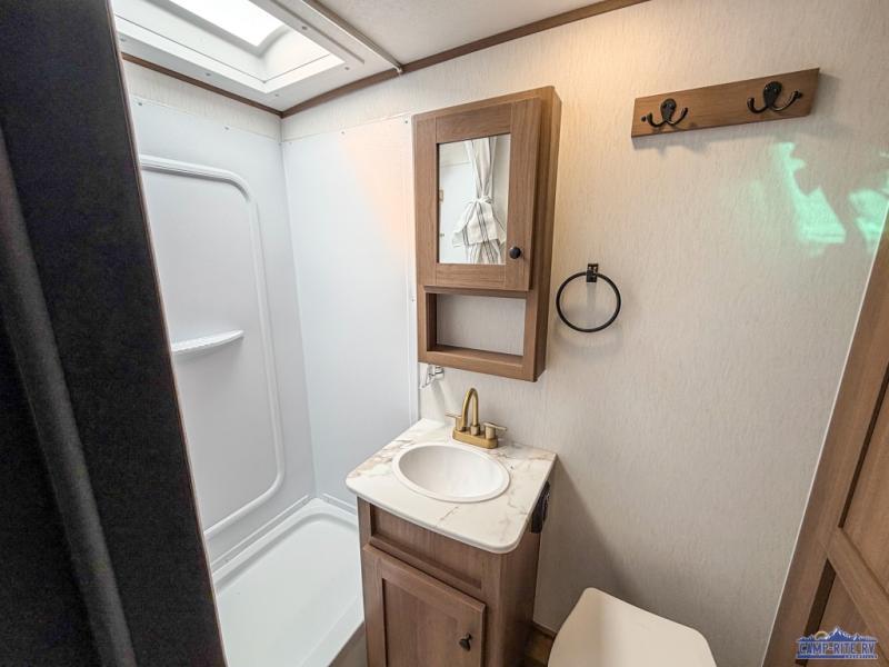 As you step inside this well-designed trailer, you'll first discover the front bedroom, complete with a cozy queen bed for a restful night’s sleep and dual wardrobes on either side to keep your clothing and essentials neatly organized. Moving into the center of the trailer, the kitchen is equipped with everything you need, including a pantry, 12V refrigerator, 2-burner cooktop, and even an air fryer microwave, making meal prep quick and convenient. Just across from the kitchen, a bar counter with chairs offers a comfortable spot to dine, relax, or enjoy conversation. At the rear, the full bathroom provides the convenience of home, featuring a shower/tub surround, a skylight for natural light, and a foot flush toilet. For added versatility, there's also an exterior hot and cold shower, perfect for rinsing off after a day outdoors.