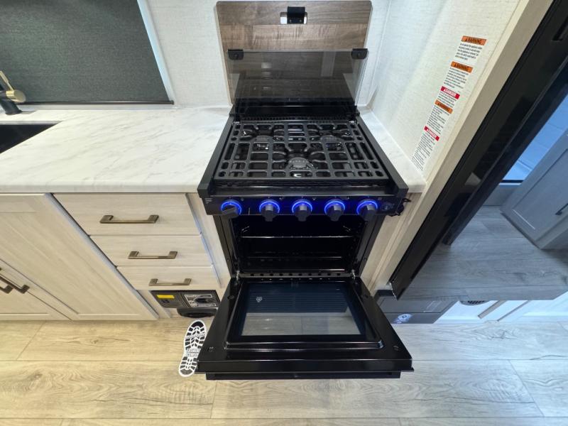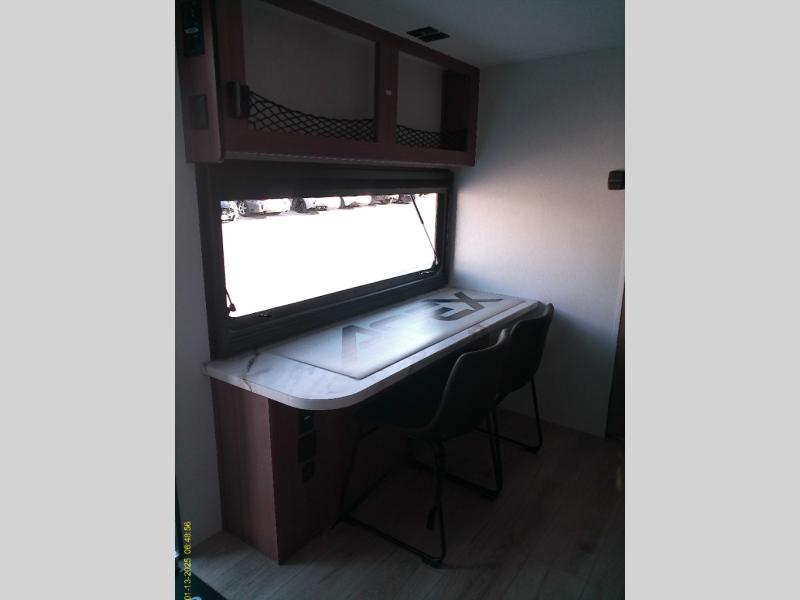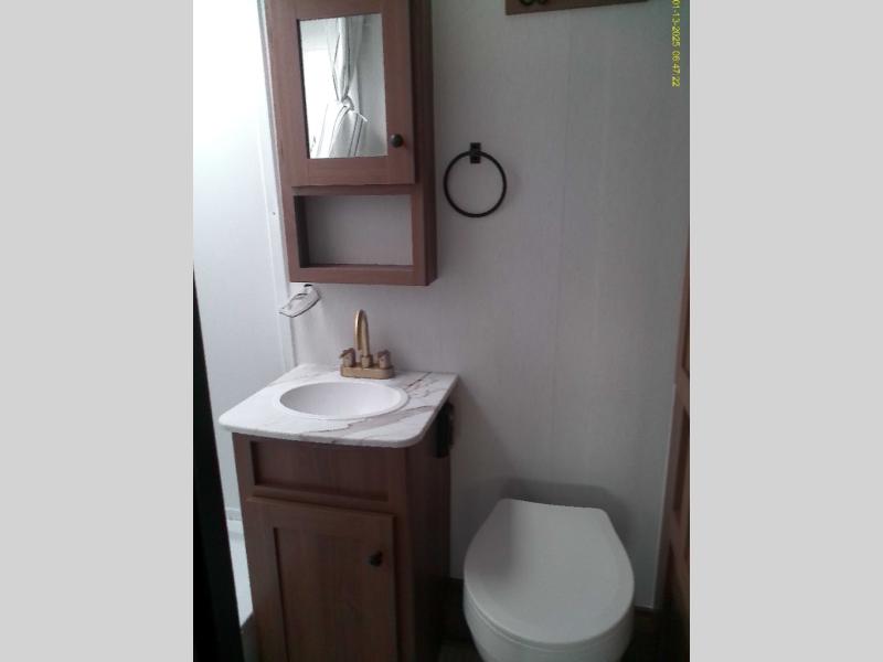 As you step inside this well-designed trailer, you'll first discover the front bedroom, complete with a cozy queen bed for a restful night’s sleep and dual wardrobes on either side to keep your clothing and essentials neatly organized. Moving into the center of the trailer, the kitchen is equipped with everything you need, including a pantry, 12V refrigerator, 2-burner cooktop, and even an air fryer microwave, making meal prep quick and convenient. Just across from the kitchen, a bar counter with chairs offers a comfortable spot to dine, relax, or enjoy conversation. At the rear, the full bathroom provides the convenience of home, featuring a shower/tub surround, a skylight for natural light, and a foot flush toilet. For added versatility, there's also an exterior hot and cold shower, perfect for rinsing off after a day outdoors.