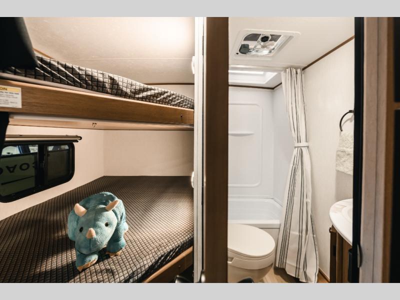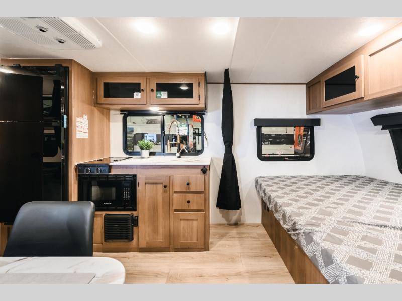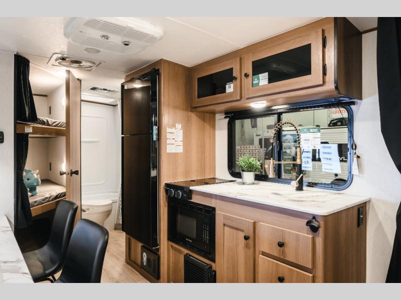 As you step into this versatile travel trailer, you'll be greeted by a front Murphy bed that offers the best of both worlds, a comfortable place to sleep at night and a cozy sofa for daytime lounging. Convenient storage is provided with a wardrobe at the foot of the bed and a nightstand on the other side for your essentials. In the center, the kitchen is fully equipped with a 10-cu. ft. refrigerator, a 2-burner cooktop, and an air fryer microwave, giving you all the tools you need to prepare your favorite meals. Across from the kitchen, a counter with chairs offers a welcoming space to dine, work, or gather. Toward the rear, double bed bunks provide additional sleeping space, with the lower bunk flipping up to reveal extra storage for your gear. Rounding out the layout is a full bathroom in the rear corner, featuring a tub/shower combo so you can enjoy the comfort and convenience of bathing right inside your trailer.