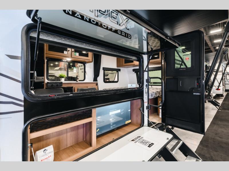 You will find comfort, convenience, and a sturdy construction with each of these Coachmen RV Apex Nano travel trailers! They are held together with an aluma-cage construction, an I-beam chassis, plus vacuum-bonded laminated dual Azdel fiberglass walls for double the protection against the elements. The 400-watt solar panel with a 30-amp control charger is included, along with two 20 lb. LP tanks, a high velocity power roof vent, plus 12V outlets to keep you powered up. More exterior features include a hot/cold shower, four stabilizer jacks, a power awning with LED lighting, and radius thumb latch baggage doors to easily pack and unload your gear. You will love the interior of your Apex Nano with Congoleum residential flooring, one-piece seamless edge countertops, matte black hardware in the galley, and a hand-crafted wood medicine cabinet in the bath.