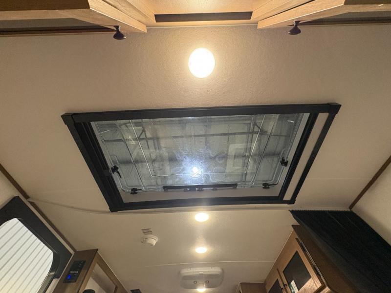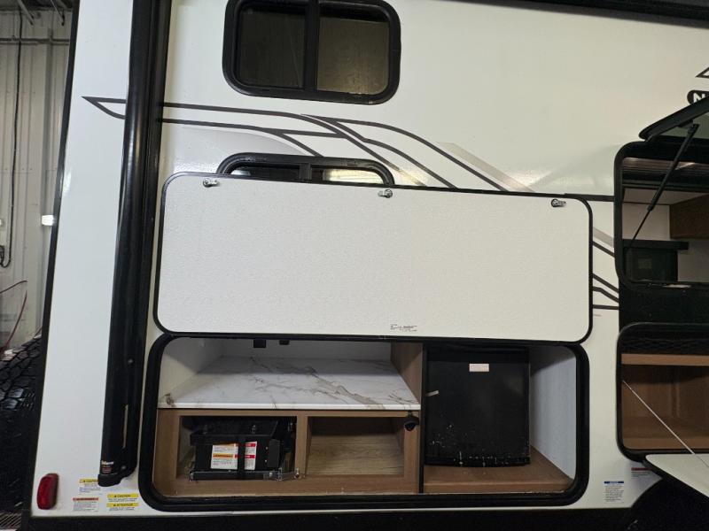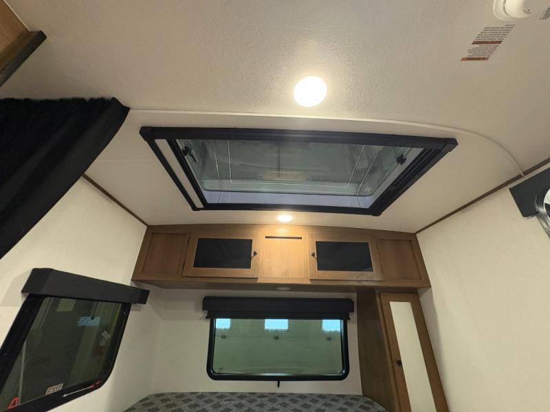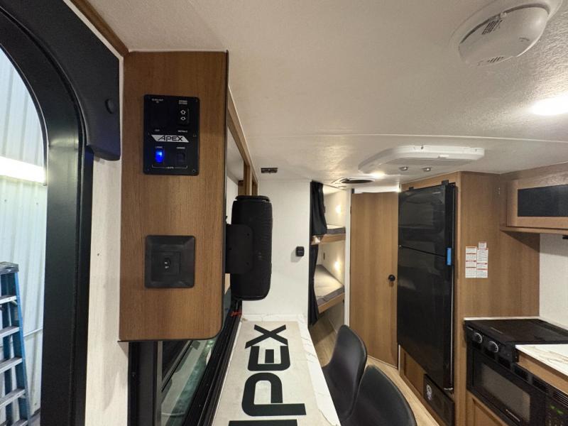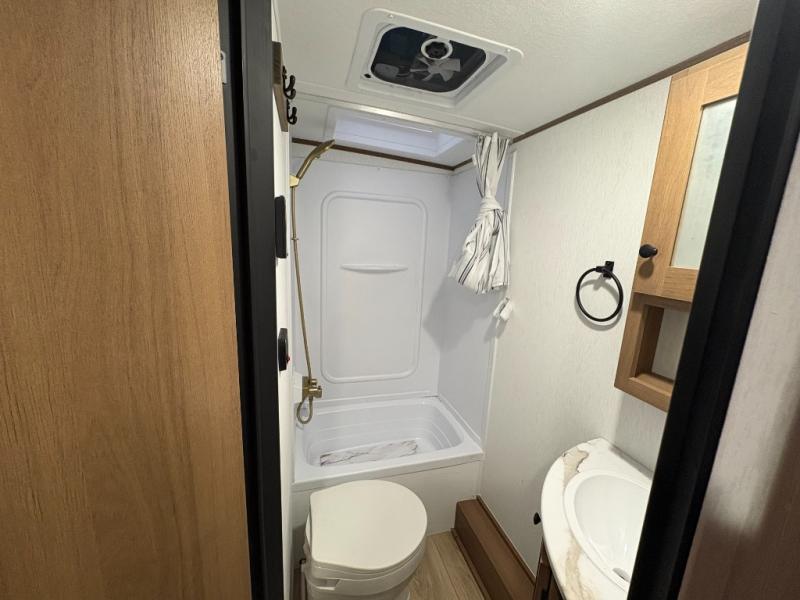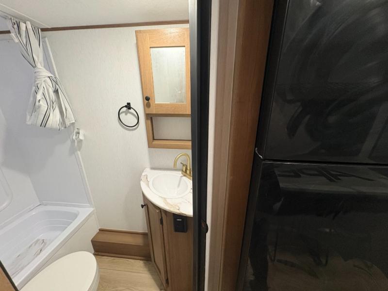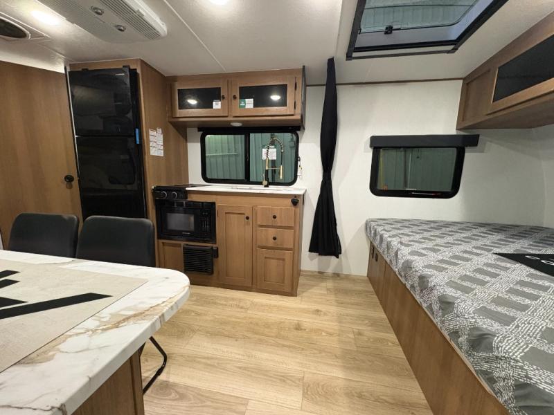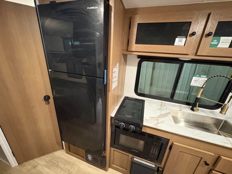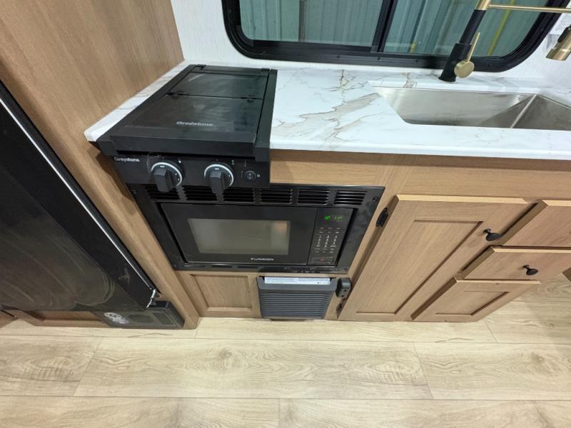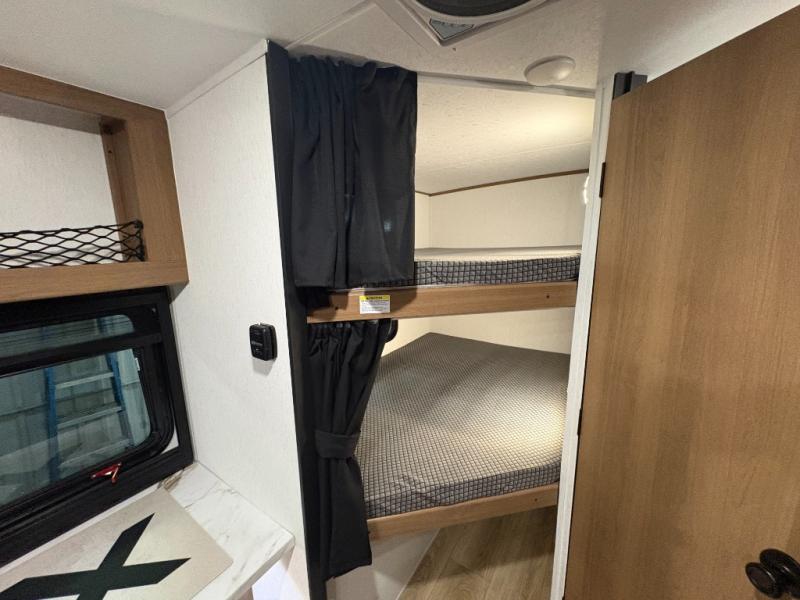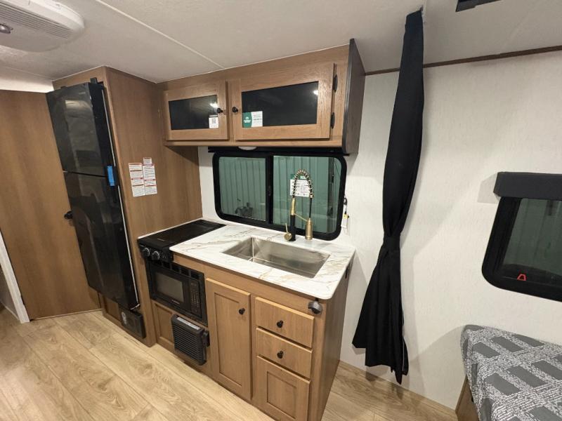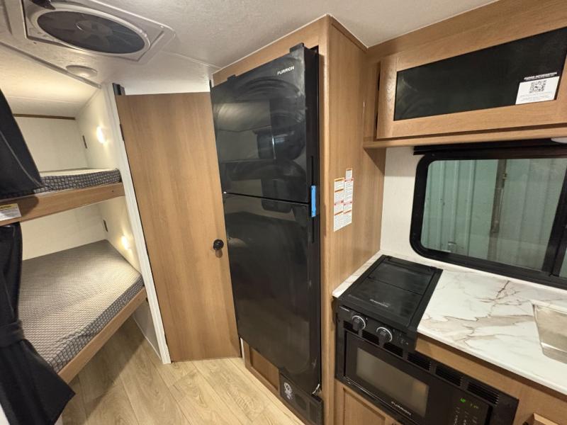 As you step into this versatile travel trailer, you'll be greeted by a front Murphy bed that offers the best of both worlds, a comfortable place to sleep at night and a cozy sofa for daytime lounging. Convenient storage is provided with a wardrobe at the foot of the bed and a nightstand on the other side for your essentials. In the center, the kitchen is fully equipped with a 10-cu. ft. refrigerator, a 2-burner cooktop, and an air fryer microwave, giving you all the tools you need to prepare your favorite meals. Across from the kitchen, a counter with chairs offers a welcoming space to dine, work, or gather. Toward the rear, double bed bunks provide additional sleeping space, with the lower bunk flipping up to reveal extra storage for your gear. Rounding out the layout is a full bathroom in the rear corner, featuring a tub/shower combo so you can enjoy the comfort and convenience of bathing right inside your trailer.