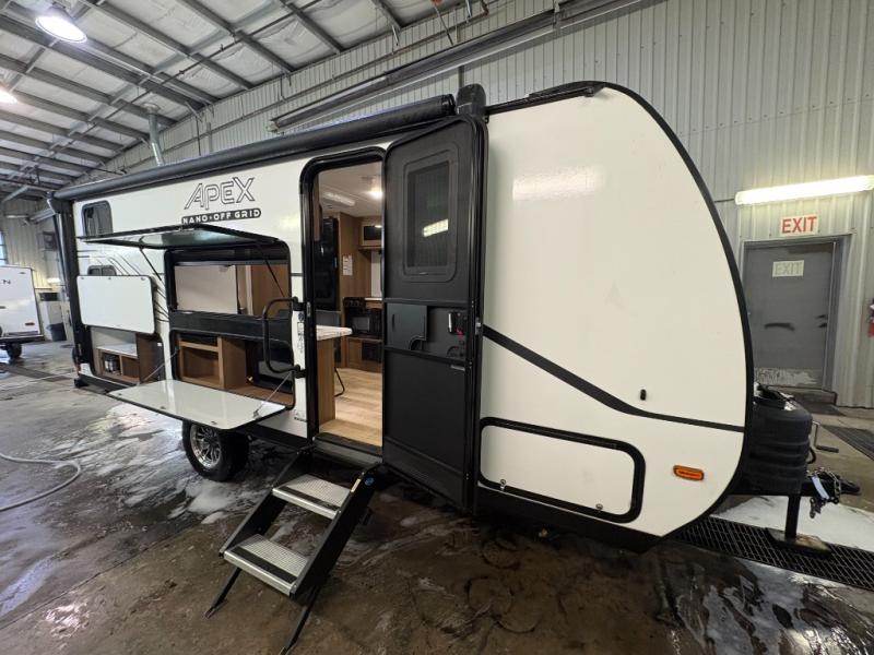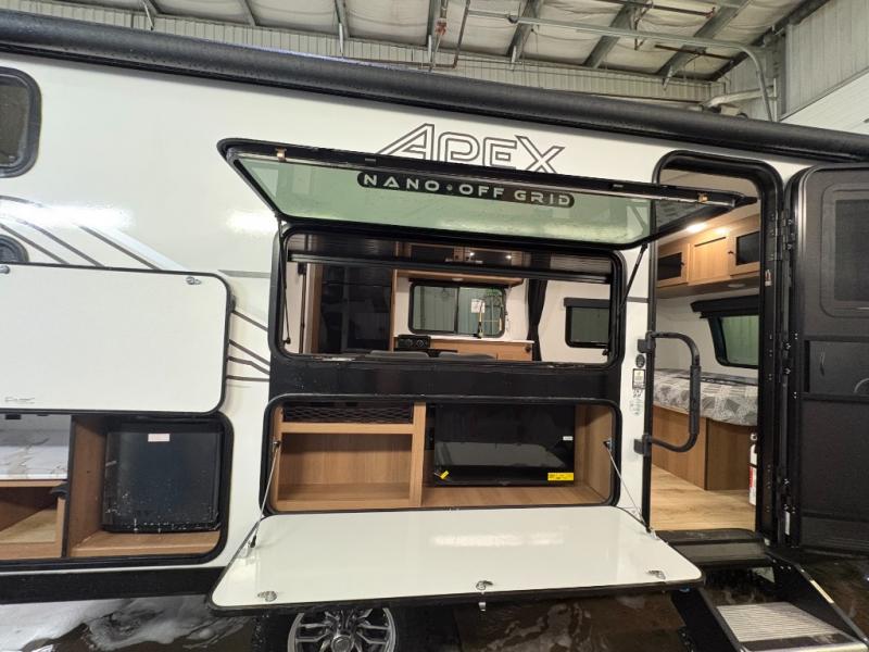 You will find comfort, convenience, and a sturdy construction with each of these Coachmen RV Apex Nano travel trailers! They are held together with an aluma-cage construction, an I-beam chassis, plus vacuum-bonded laminated dual Azdel fiberglass walls for double the protection against the elements. The 400-watt solar panel with a 30-amp control charger is included, along with two 20 lb. LP tanks, a high velocity power roof vent, plus 12V outlets to keep you powered up. More exterior features include a hot/cold shower, four stabilizer jacks, a power awning with LED lighting, and radius thumb latch baggage doors to easily pack and unload your gear. You will love the interior of your Apex Nano with Congoleum residential flooring, one-piece seamless edge countertops, matte black hardware in the galley, and a hand-crafted wood medicine cabinet in the bath.