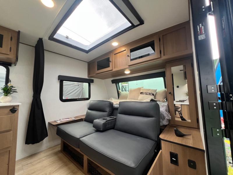 You will find comfort, convenience, and a sturdy construction with each of these Coachmen RV Apex Nano travel trailers! They are held together with an aluma-cage construction, an I-beam chassis, plus vacuum-bonded laminated dual Azdel fiberglass walls for double the protection against the elements. The 400-watt solar panel with a 30-amp control charger is included, along with two 20 lb. LP tanks, a high velocity power roof vent, plus 12V outlets to keep you powered up. More exterior features include a hot/cold shower, four stabilizer jacks, a power awning with LED lighting, and radius thumb latch baggage doors to easily pack and unload your gear. You will love the interior of your Apex Nano with Congoleum residential flooring, one-piece seamless edge countertops, matte black hardware in the galley, and a hand-crafted wood medicine cabinet in the bath.