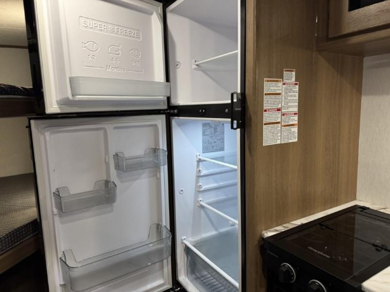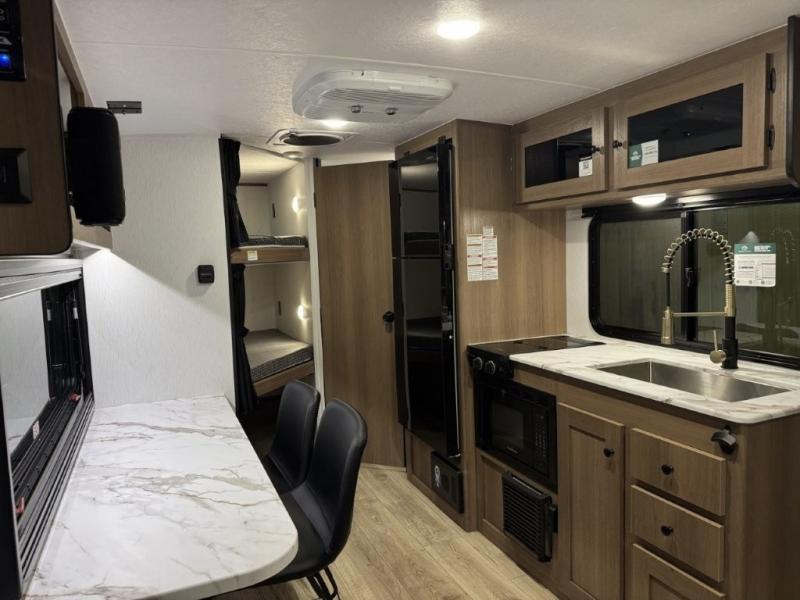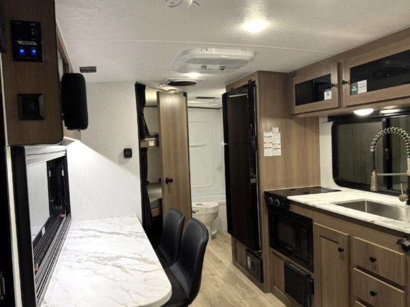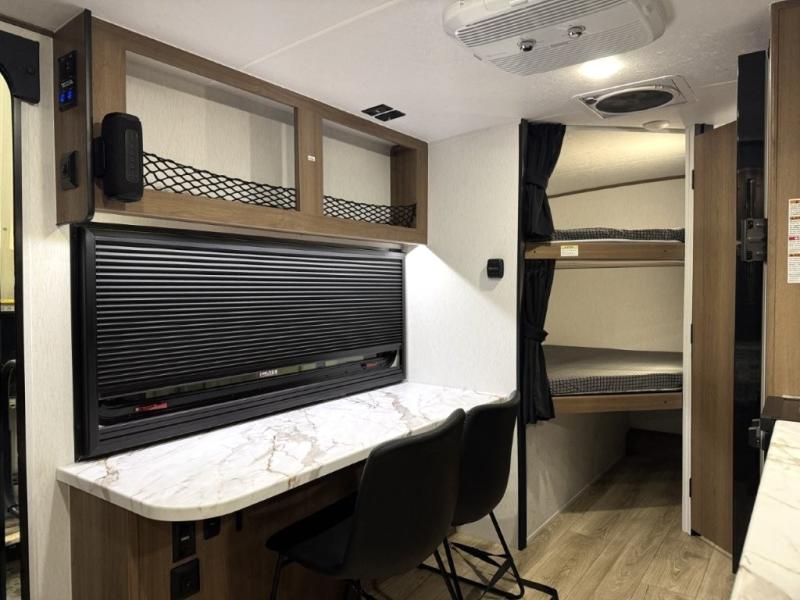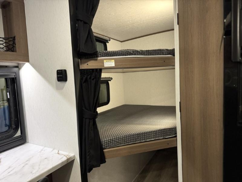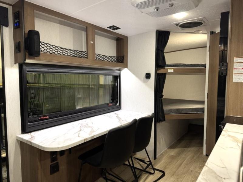 As you step into this versatile travel trailer, you'll be greeted by a front bed with a star gazer complete with a shade system above the bed area. Convenient storage is provided with a wardrobe at the foot of the bed and a nightstand on the other side for your essentials. In the center, the kitchen is fully equipped with a 10-cu. ft. refrigerator, a 2-burner cooktop, and an air fryer microwave, giving you all the tools you need to prepare your favorite meals. Across from the kitchen, a counter with chairs offers a welcoming space to dine, work, or gather. Toward the rear, double bed bunks provide additional sleeping space, with the lower bunk flipping up to reveal extra storage for your gear. Rounding out the layout is a full bathroom in the rear corner, featuring a tub/shower combo so you can enjoy the comfort and convenience of bathing right inside your trailer.