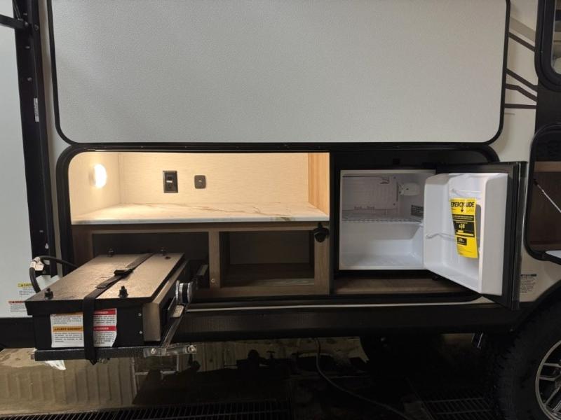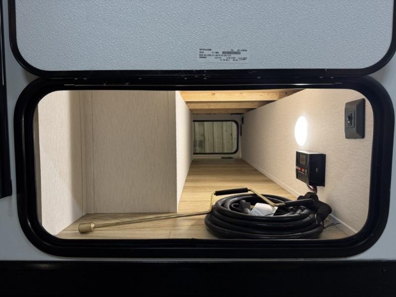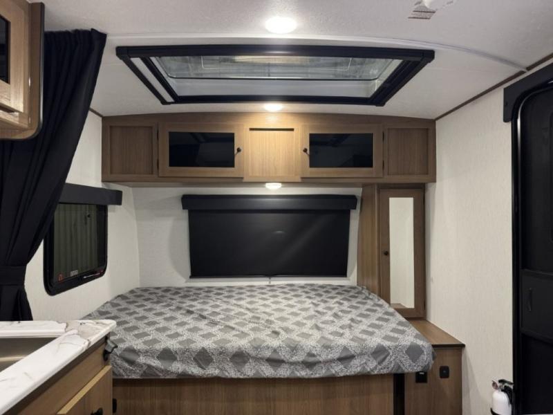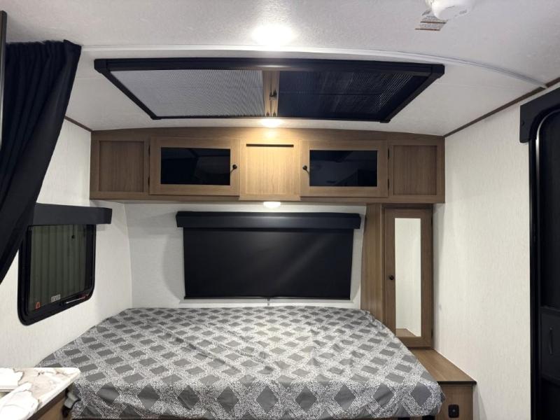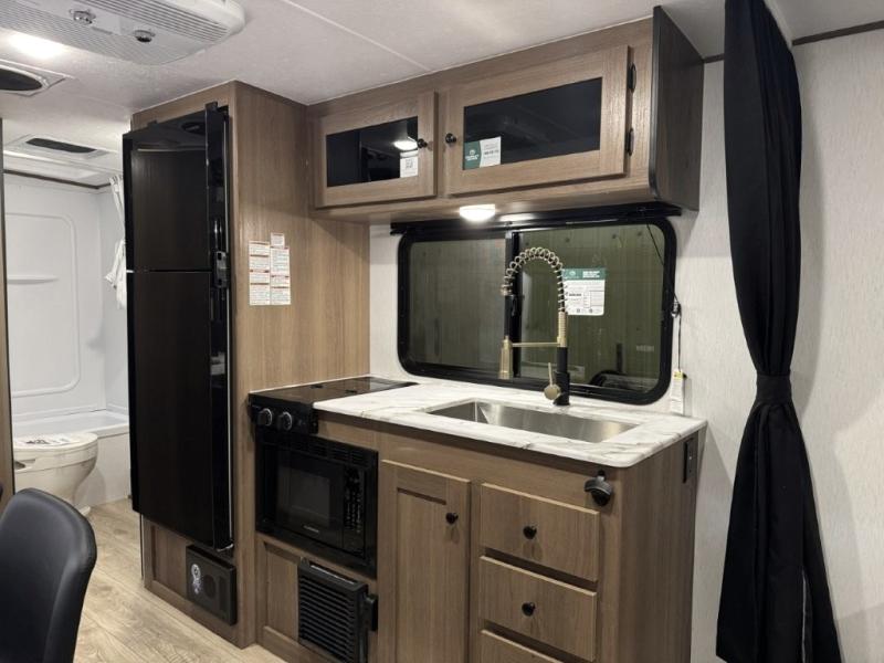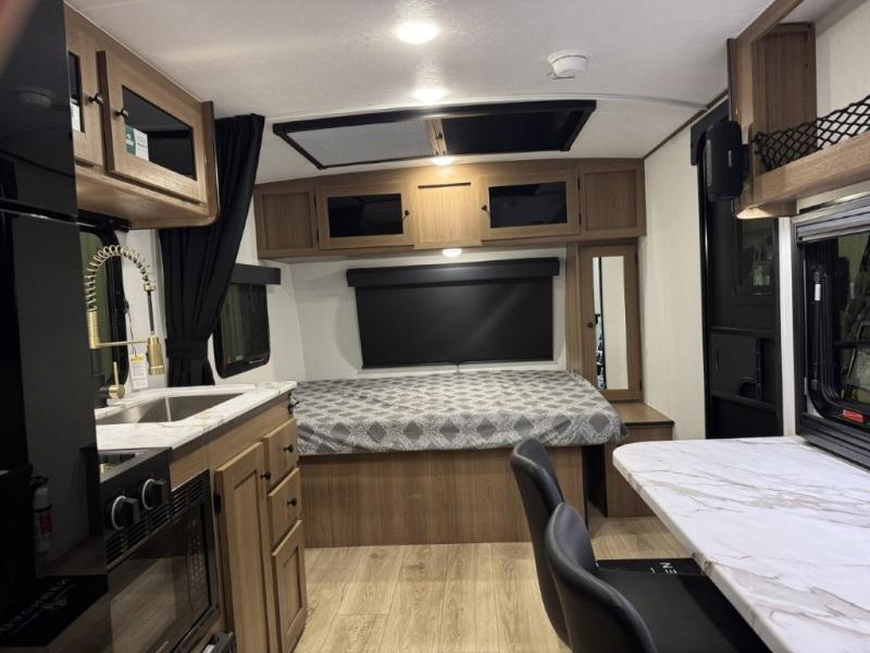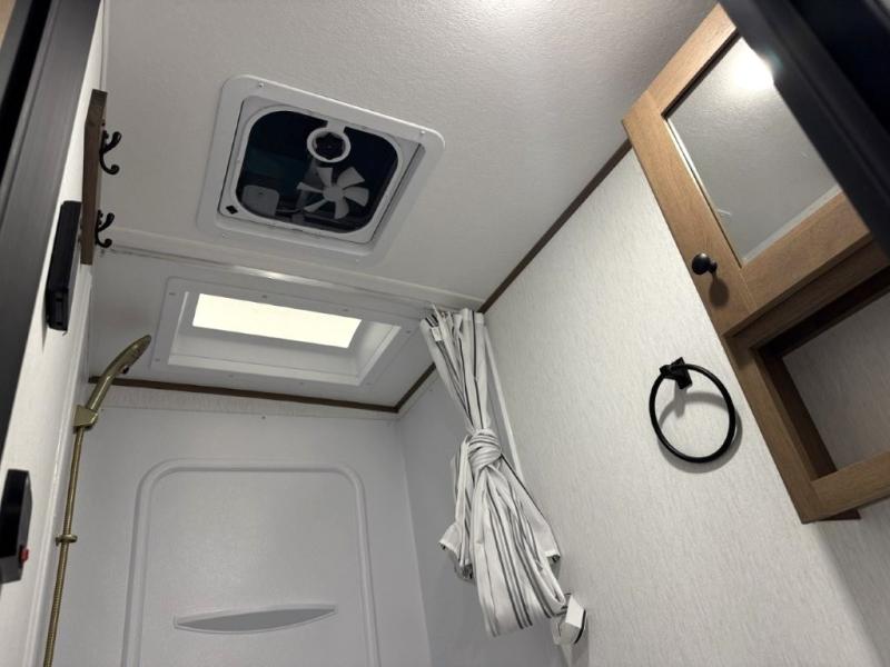 As you step into this versatile travel trailer, you'll be greeted by a front bed with a star gazer complete with a shade system above the bed area. Convenient storage is provided with a wardrobe at the foot of the bed and a nightstand on the other side for your essentials. In the center, the kitchen is fully equipped with a 10-cu. ft. refrigerator, a 2-burner cooktop, and an air fryer microwave, giving you all the tools you need to prepare your favorite meals. Across from the kitchen, a counter with chairs offers a welcoming space to dine, work, or gather. Toward the rear, double bed bunks provide additional sleeping space, with the lower bunk flipping up to reveal extra storage for your gear. Rounding out the layout is a full bathroom in the rear corner, featuring a tub/shower combo so you can enjoy the comfort and convenience of bathing right inside your trailer.