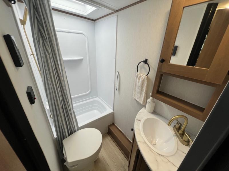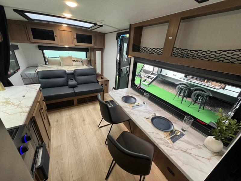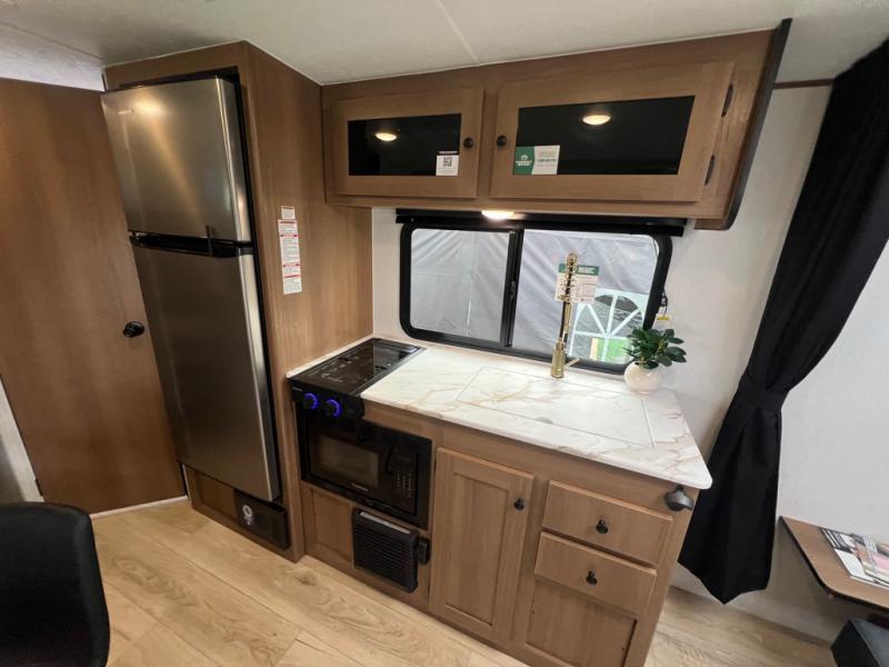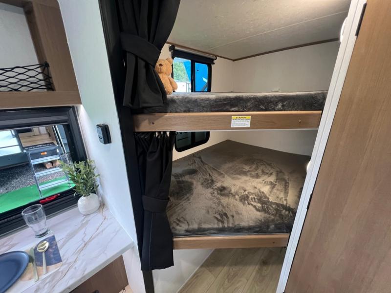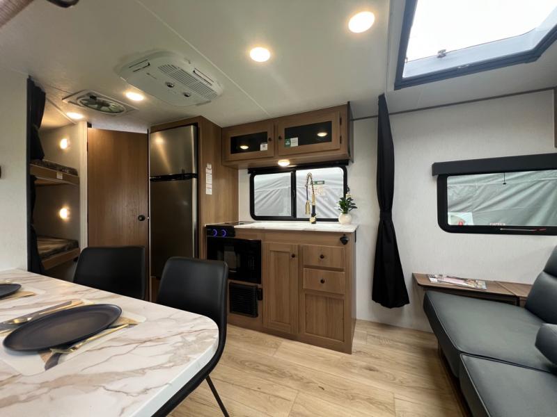As you step into this versatile travel trailer, you'll be greeted by a front Murphy bed that offers the best of both worlds, a comfortable place to sleep at night and a cozy sofa for daytime lounging. Convenient storage is provided with a wardrobe at the foot of the bed and a nightstand on the other side for your essentials. In the center, the kitchen is fully equipped with a 10-cu. ft. refrigerator, a 2-burner cooktop, and an air fryer microwave, giving you all the tools you need to prepare your favorite meals. Across from the kitchen, a counter with chairs offers a welcoming space to dine, work, or gather. Toward the rear, double bed bunks provide additional sleeping space, with the lower bunk flipping up to reveal extra storage for your gear. Rounding out the layout is a full bathroom in the rear corner, featuring a tub/shower combo so you can enjoy the comfort and convenience of bathing right inside your trailer.