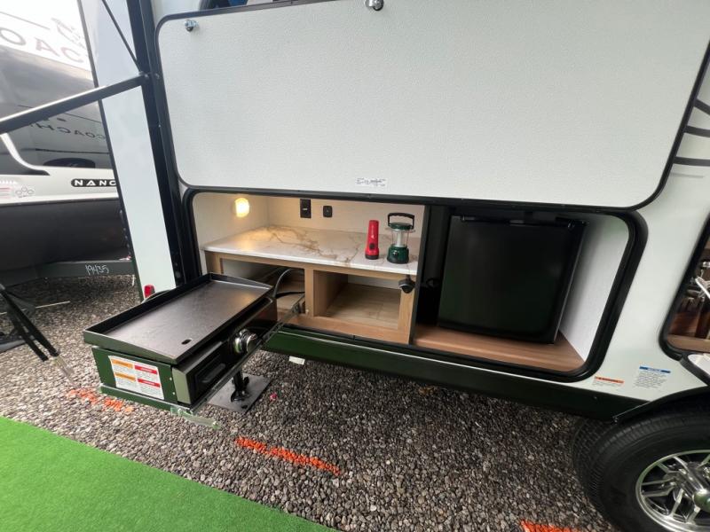 You will find comfort, convenience, and a sturdy construction with each of these Coachmen RV Apex Nano travel trailers! They are held together with an aluma-cage construction, an I-beam chassis, plus vacuum-bonded laminated dual Azdel fiberglass walls for double the protection against the elements. The 400-watt solar panel with a 30-amp control charger is included, along with two 20 lb. LP tanks, a high velocity power roof vent, plus 12V outlets to keep you powered up. More exterior features include a hot/cold shower, four stabilizer jacks, a power awning with LED lighting, and radius thumb latch baggage doors to easily pack and unload your gear. You will love the interior of your Apex Nano with Congoleum residential flooring, one-piece seamless edge countertops, matte black hardware in the galley, and a hand-crafted wood medicine cabinet in the bath.