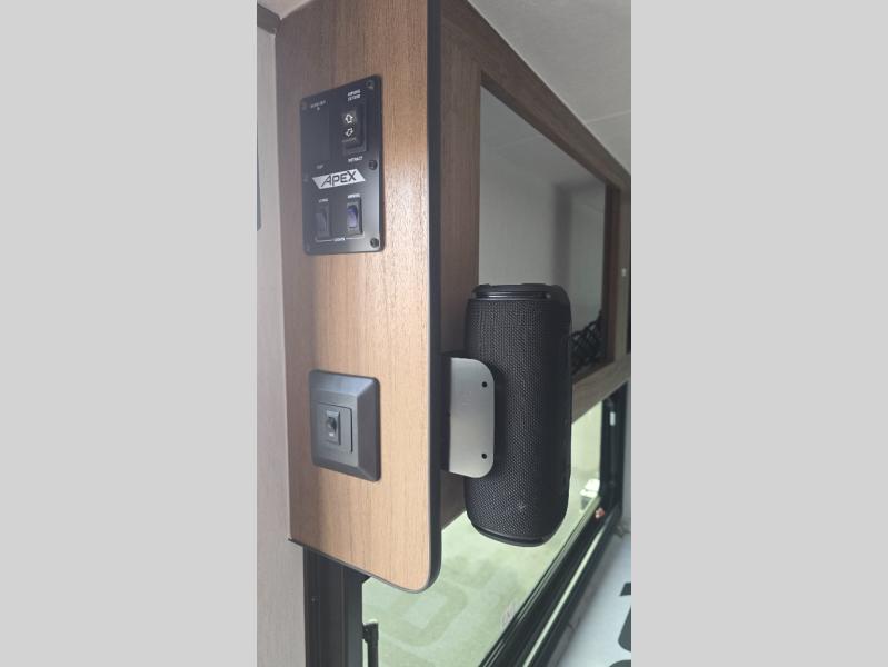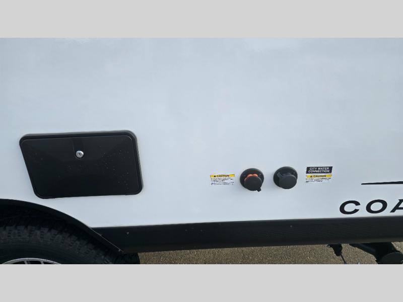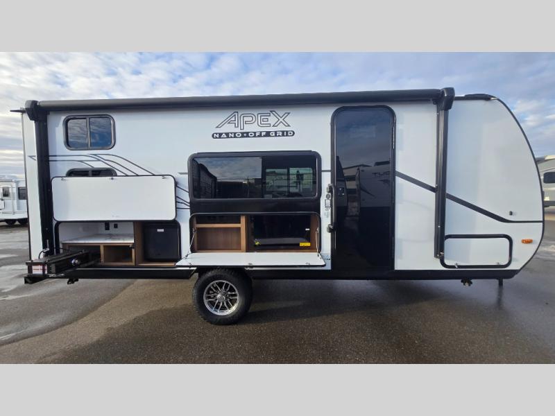 You will find comfort, convenience, and a sturdy construction with each of these Coachmen RV Apex Nano travel trailers! They are held together with an aluma-cage construction, an I-beam chassis, plus vacuum-bonded laminated dual Azdel fiberglass walls for double the protection against the elements. The 400-watt solar panel with a 30-amp control charger is included, along with two 20 lb. LP tanks, a high velocity power roof vent, plus 12V outlets to keep you powered up. More exterior features include a hot/cold shower, four stabilizer jacks, a power awning with LED lighting, and radius thumb latch baggage doors to easily pack and unload your gear. You will love the interior of your Apex Nano with Congoleum residential flooring, one-piece seamless edge countertops, matte black hardware in the galley, and a hand-crafted wood medicine cabinet in the bath.