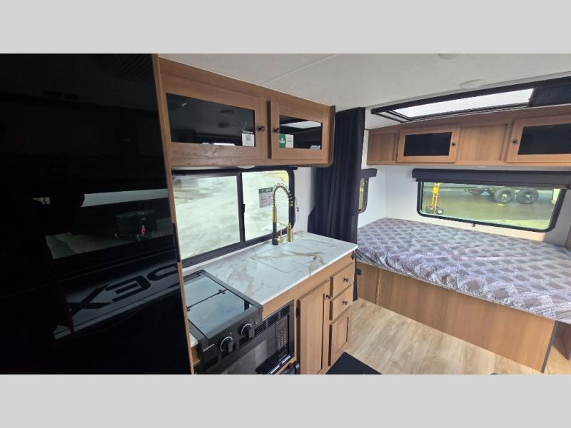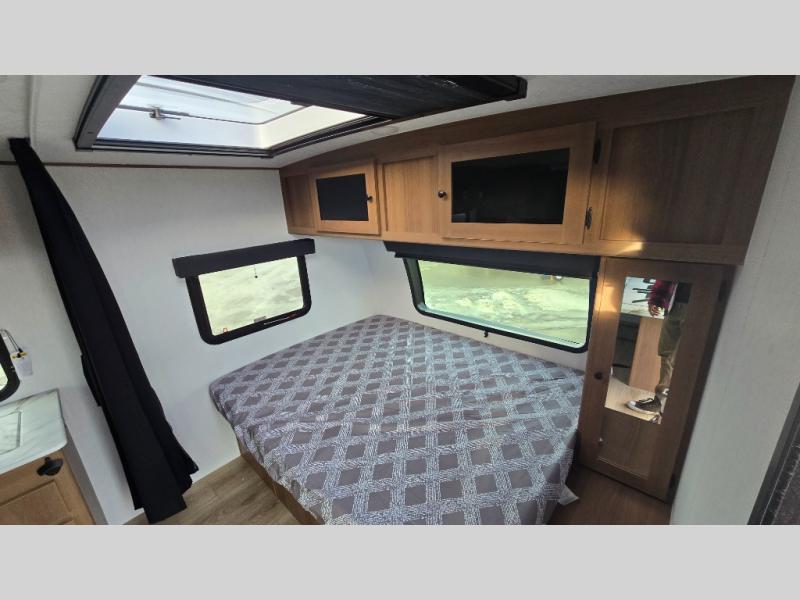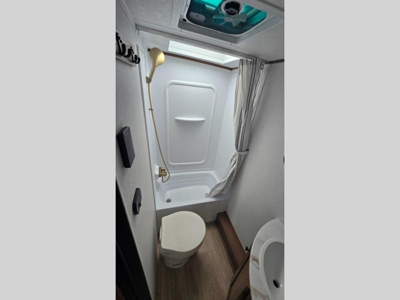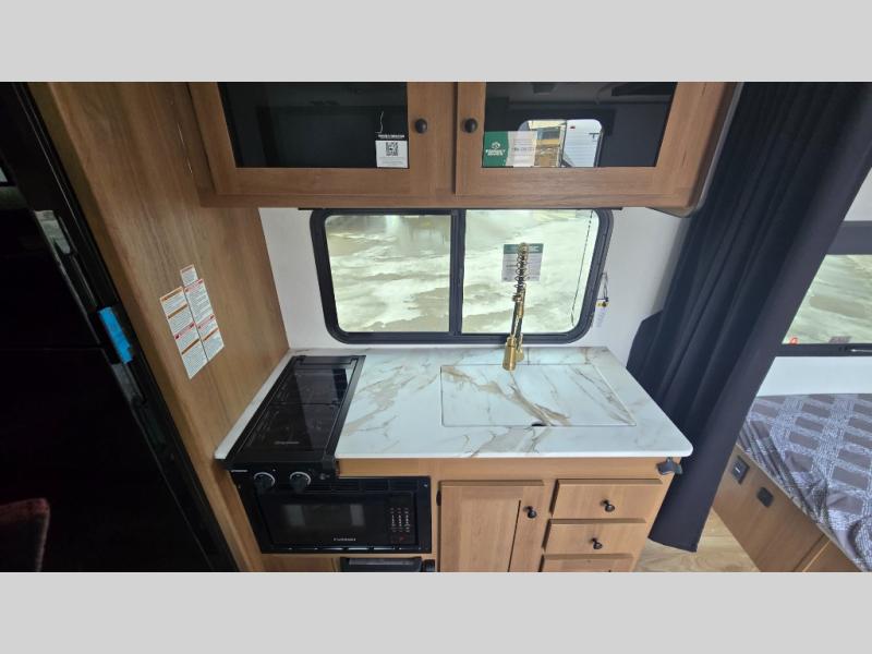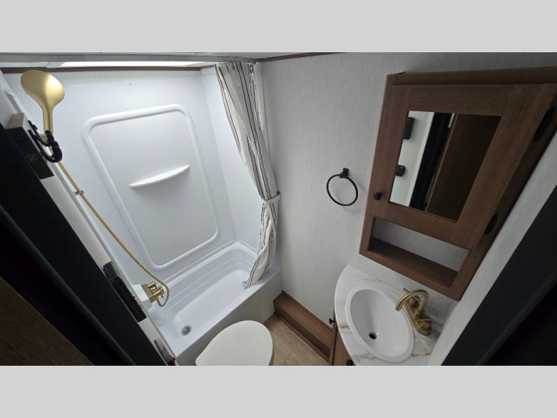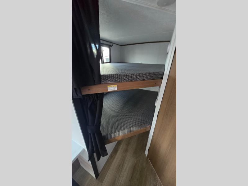 As you step into this versatile travel trailer, you'll be greeted by a front Murphy bed that offers the best of both worlds, a comfortable place to sleep at night and a cozy sofa for daytime lounging. Convenient storage is provided with a wardrobe at the foot of the bed and a nightstand on the other side for your essentials. In the center, the kitchen is fully equipped with a 10-cu. ft. refrigerator, a 2-burner cooktop, and an air fryer microwave, giving you all the tools you need to prepare your favorite meals. Across from the kitchen, a counter with chairs offers a welcoming space to dine, work, or gather. Toward the rear, double bed bunks provide additional sleeping space, with the lower bunk flipping up to reveal extra storage for your gear. Rounding out the layout is a full bathroom in the rear corner, featuring a tub/shower combo so you can enjoy the comfort and convenience of bathing right inside your trailer.