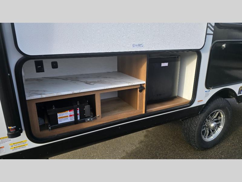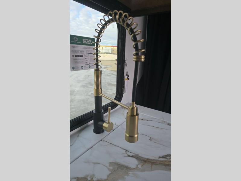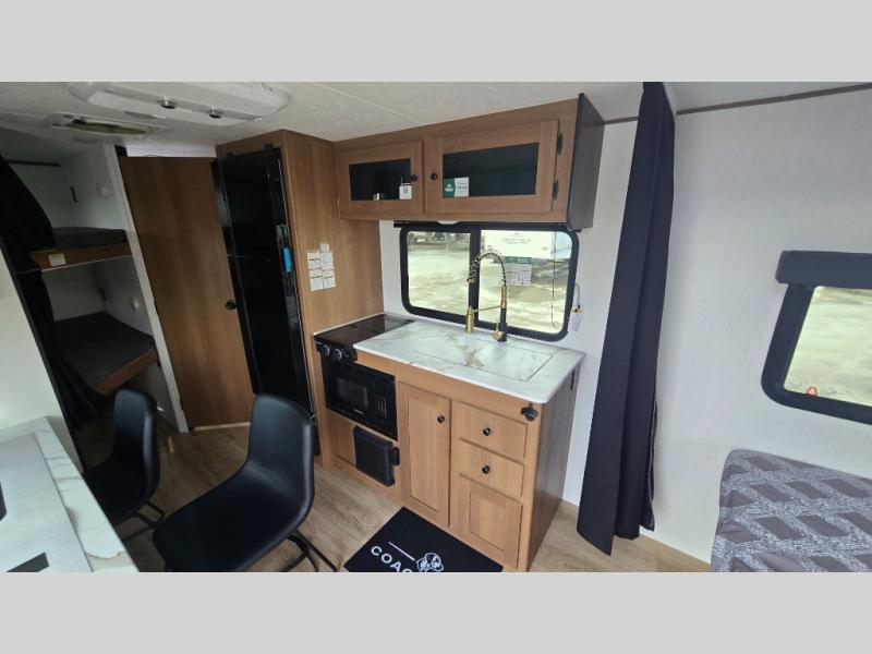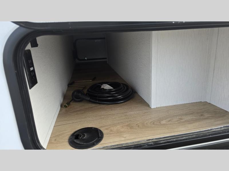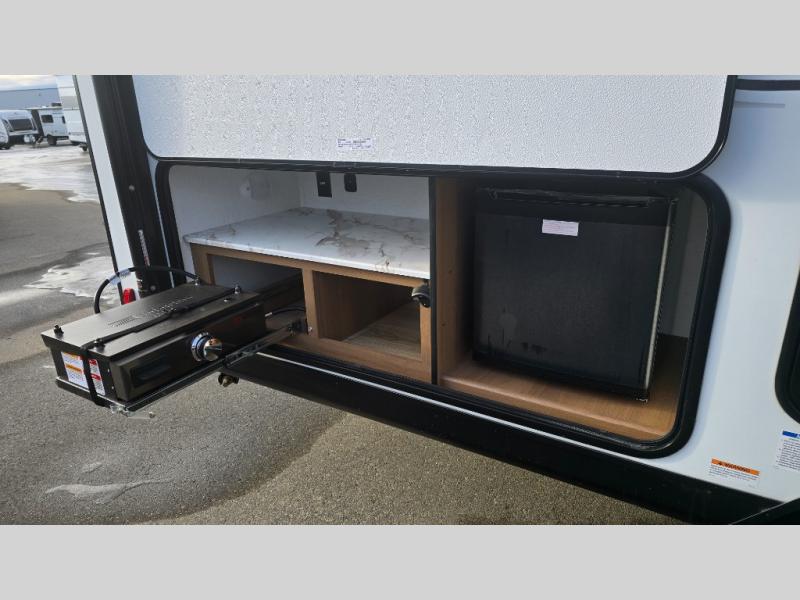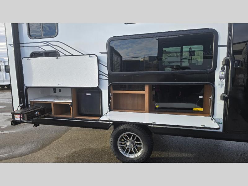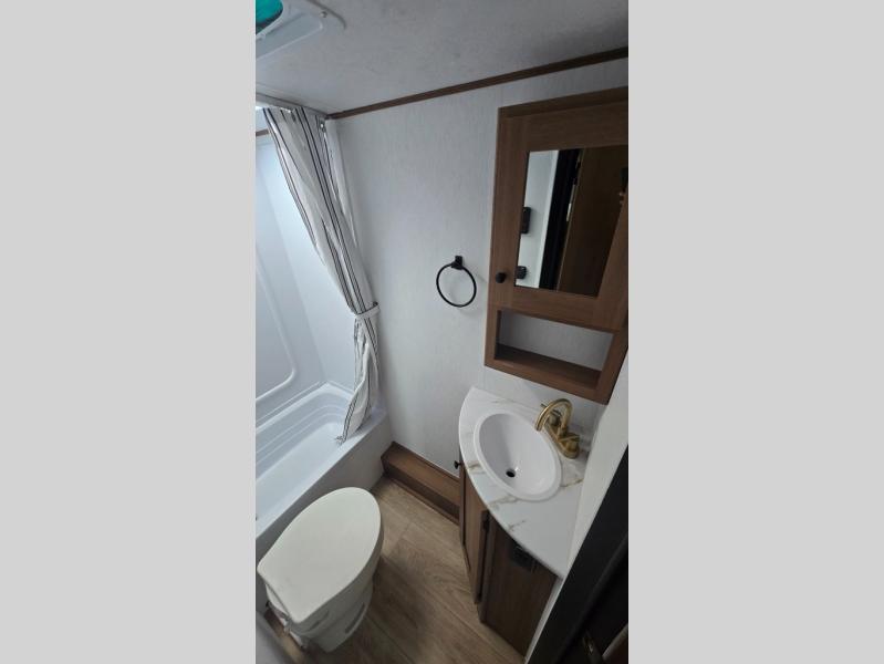 As you step into this versatile travel trailer, you'll be greeted by a front Murphy bed that offers the best of both worlds, a comfortable place to sleep at night and a cozy sofa for daytime lounging. Convenient storage is provided with a wardrobe at the foot of the bed and a nightstand on the other side for your essentials. In the center, the kitchen is fully equipped with a 10-cu. ft. refrigerator, a 2-burner cooktop, and an air fryer microwave, giving you all the tools you need to prepare your favorite meals. Across from the kitchen, a counter with chairs offers a welcoming space to dine, work, or gather. Toward the rear, double bed bunks provide additional sleeping space, with the lower bunk flipping up to reveal extra storage for your gear. Rounding out the layout is a full bathroom in the rear corner, featuring a tub/shower combo so you can enjoy the comfort and convenience of bathing right inside your trailer.