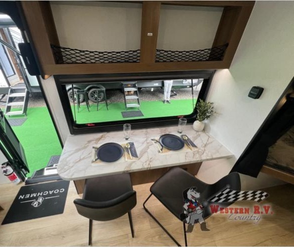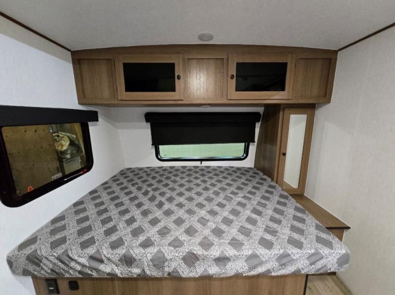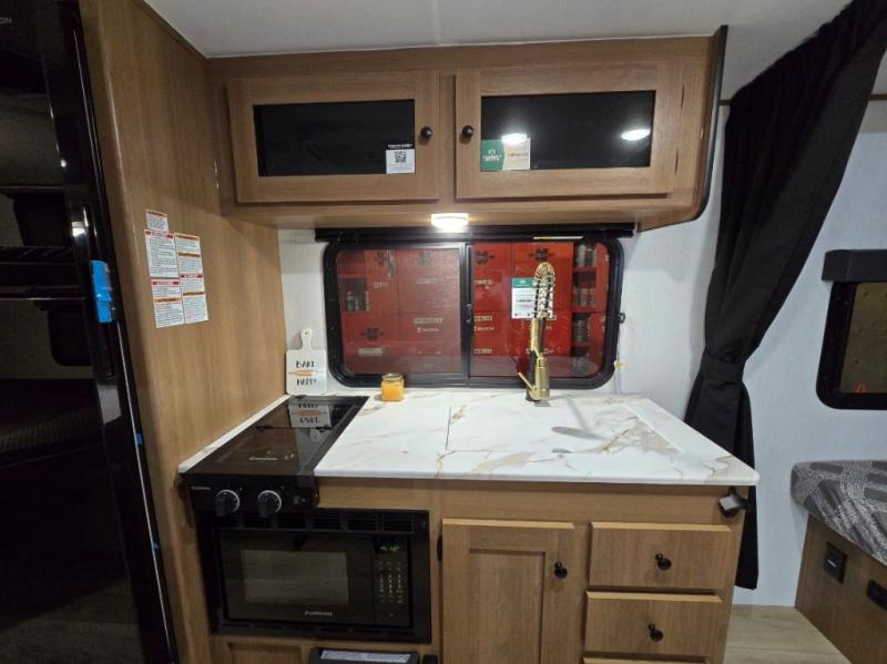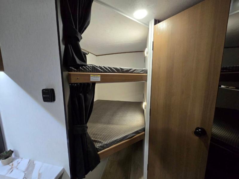 Convenient storage is provided with a wardrobe at the foot of the bed and a nightstand on the other side for your essentials. In the center, the kitchen is fully equipped with a 10-cu. ft. refrigerator, a 2-burner cooktop, and an air fryer microwave, giving you all the tools you need to prepare your favorite meals. Across from the kitchen, a counter with chairs offers a welcoming space to dine, work, or gather. Toward the rear, double bed bunks provide additional sleeping space, with the lower bunk flipping up to reveal extra storage for your gear. Rounding out the layout is a full bathroom in the rear corner, featuring a tub/shower combo so you can enjoy the comfort and convenience of bathing right inside your trailer.
