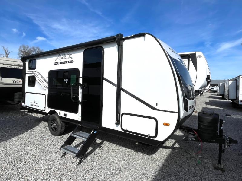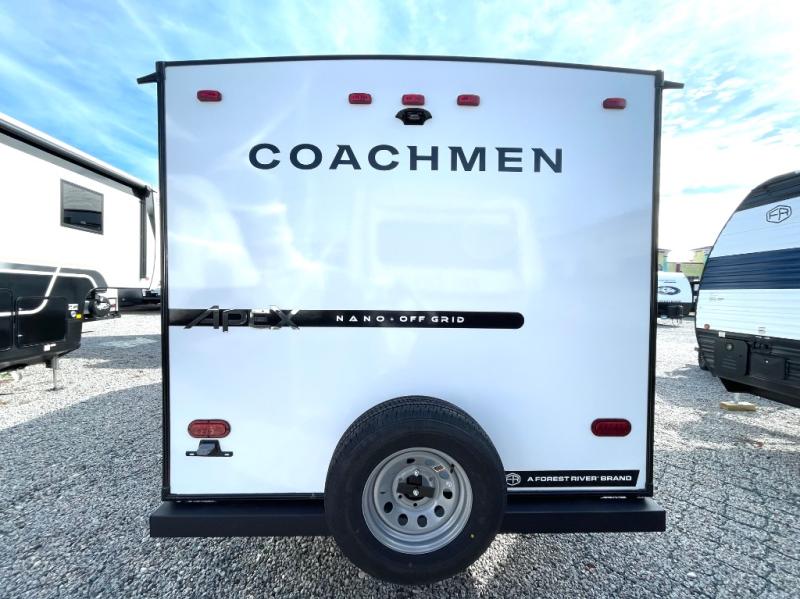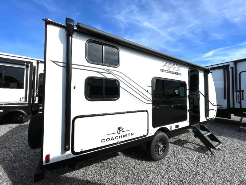 You will find comfort, convenience, and a sturdy construction with each of these Coachmen RV Apex Nano travel trailers! They are held together with an aluma-cage construction, an I-beam chassis, plus vacuum-bonded laminated dual Azdel fiberglass walls for double the protection against the elements. The 400-watt solar panel with a 30-amp control charger is included, along with two 20 lb. LP tanks, a high velocity power roof vent, plus 12V outlets to keep you powered up. More exterior features include a hot/cold shower, four stabilizer jacks, a power awning with LED lighting, and radius thumb latch baggage doors to easily pack and unload your gear. You will love the interior of your Apex Nano with Congoleum residential flooring, one-piece seamless edge countertops, matte black hardware in the galley, and a hand-crafted wood medicine cabinet in the bath.
