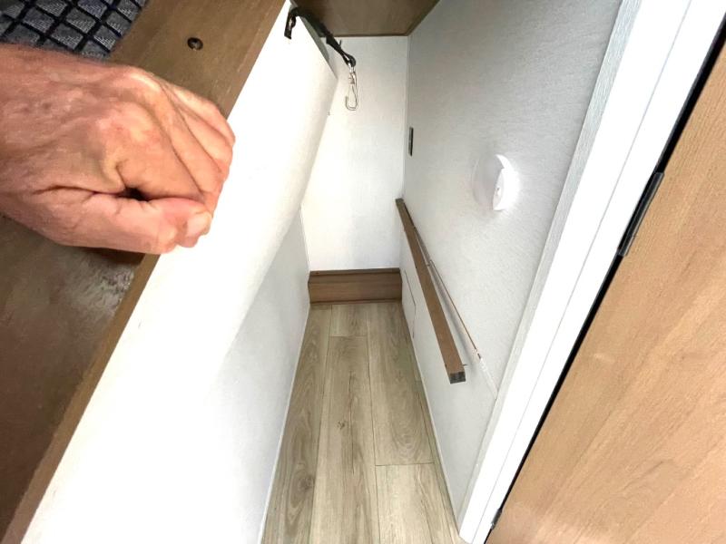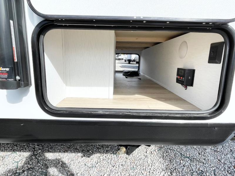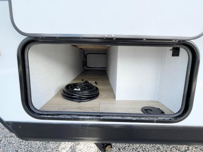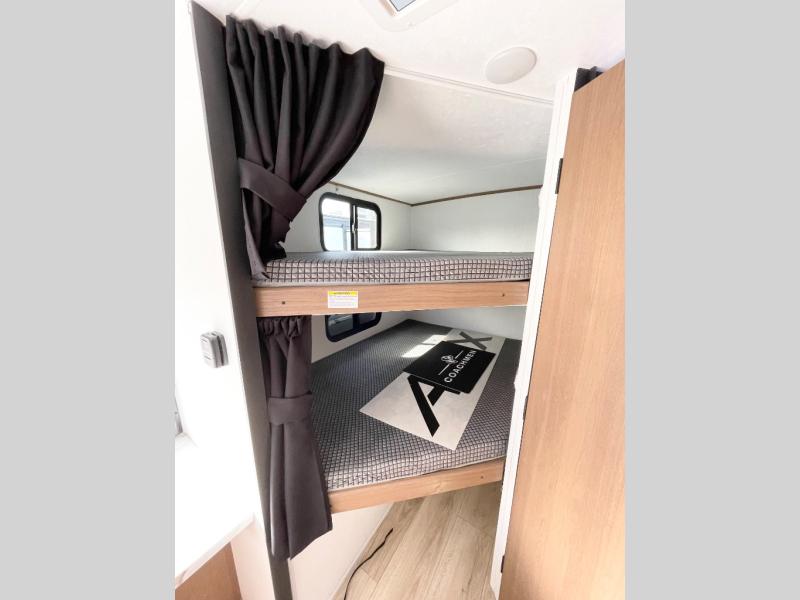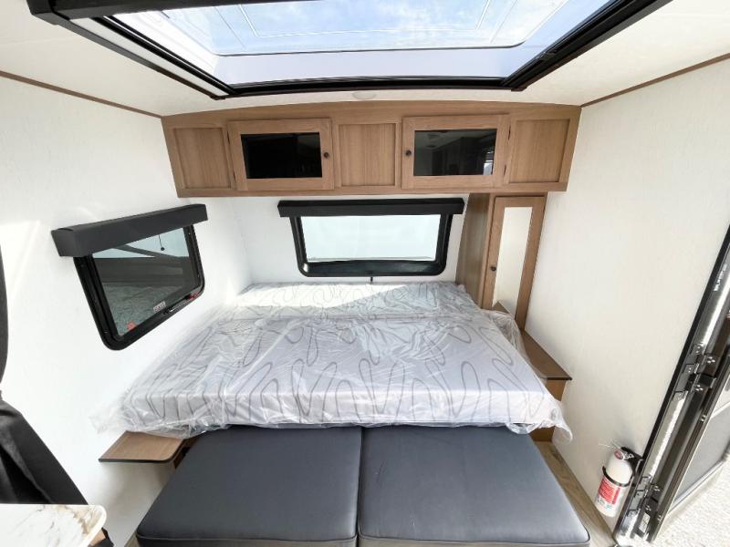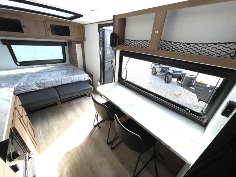 As you step into this versatile travel trailer, you'll be greeted by a front Murphy bed that offers the best of both worlds, a comfortable place to sleep at night and a cozy sofa for daytime lounging. Convenient storage is provided with a wardrobe at the foot of the bed and a nightstand on the other side for your essentials. In the center, the kitchen is fully equipped with a 10-cu. ft. refrigerator, a 2-burner cooktop, and an air fryer microwave, giving you all the tools you need to prepare your favorite meals. Across from the kitchen, a counter with chairs offers a welcoming space to dine, work, or gather. Toward the rear, double bed bunks provide additional sleeping space, with the lower bunk flipping up to reveal extra storage for your gear. Rounding out the layout is a full bathroom in the rear corner, featuring a tub/shower combo so you can enjoy the comfort and convenience of bathing right inside your trailer.