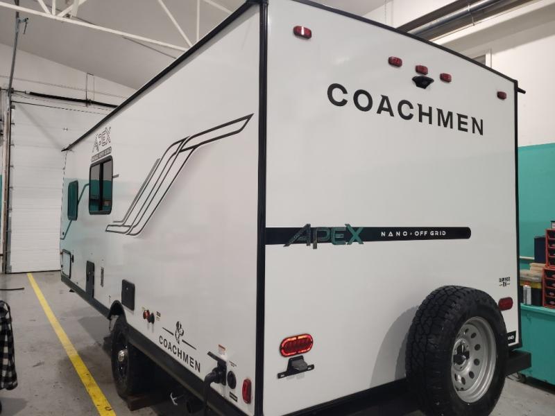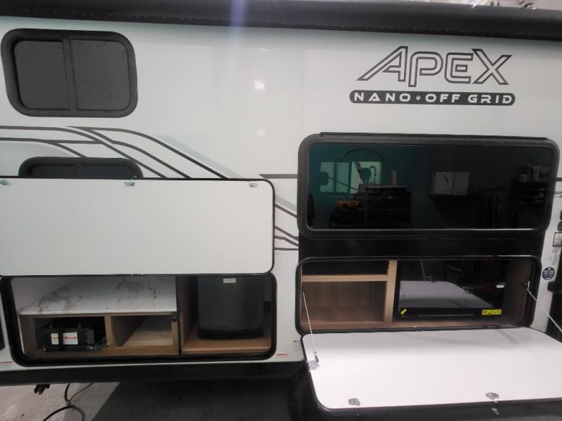 You will find comfort, convenience, and a sturdy construction with each of these Coachmen RV Apex Nano travel trailers! They are held together with an aluma-cage construction, an I-beam chassis, plus vacuum-bonded laminated dual Azdel fiberglass walls for double the protection against the elements. The 400-watt solar panel with a 30-amp control charger is included, along with two 20 lb. LP tanks, a high velocity power roof vent, plus 12V outlets to keep you powered up. More exterior features include a hot/cold shower, four stabilizer jacks, a power awning with LED lighting, and radius thumb latch baggage doors to easily pack and unload your gear. You will love the interior of your Apex Nano with Congoleum residential flooring, one-piece seamless edge countertops, matte black hardware in the galley, and a hand-crafted wood medicine cabinet in the bath.