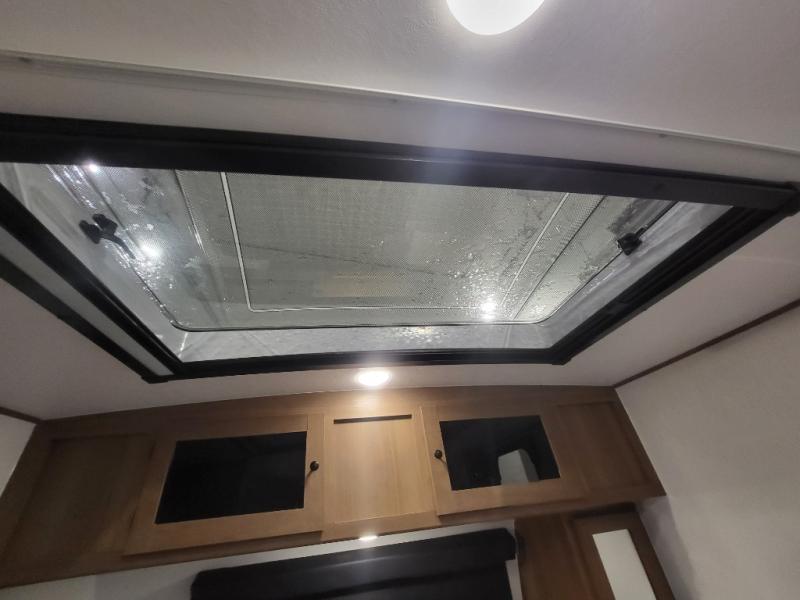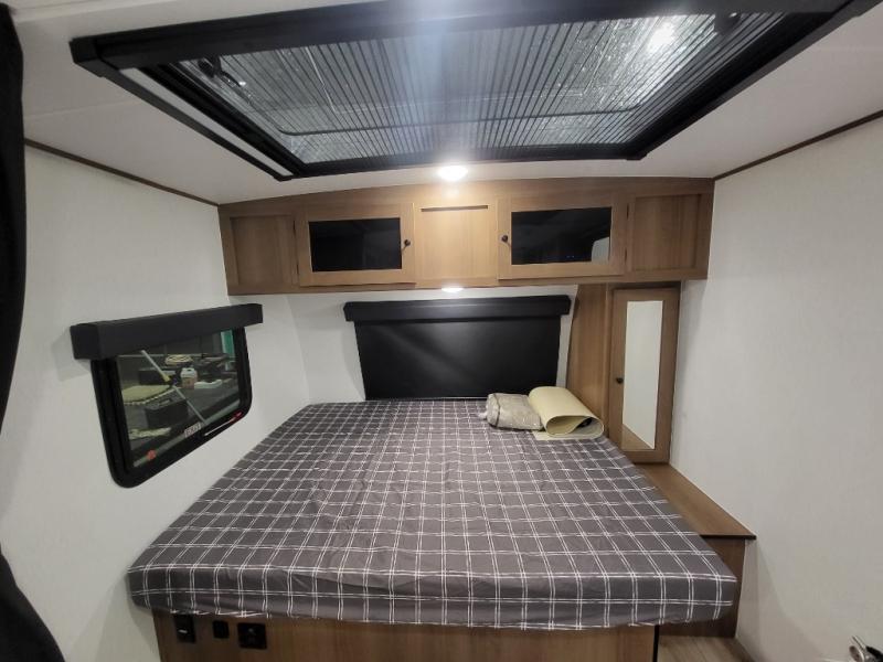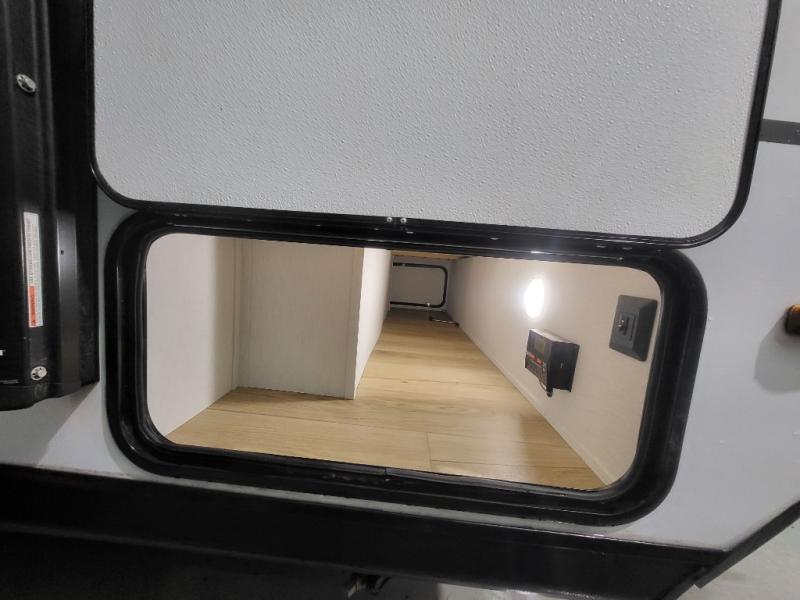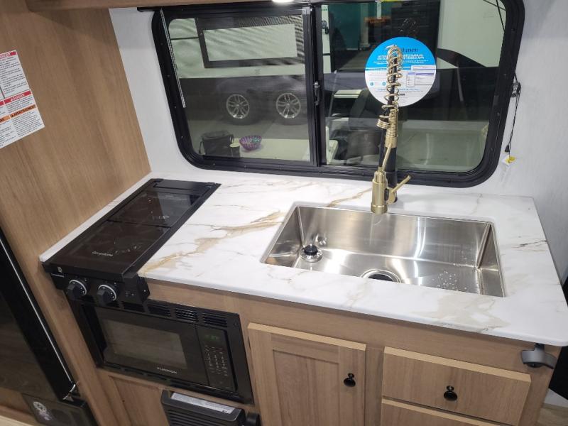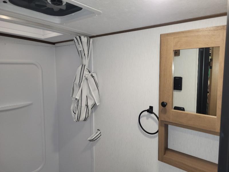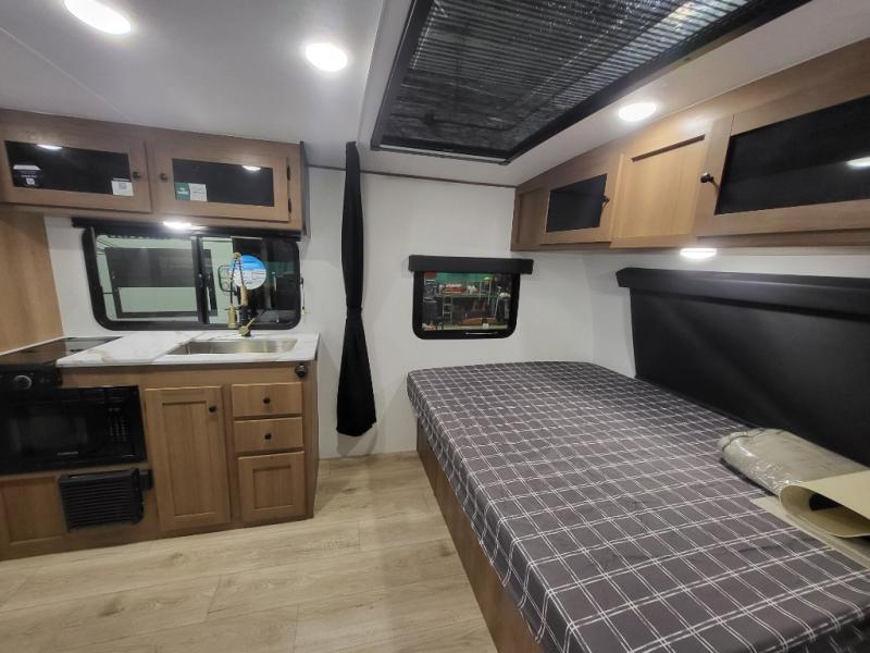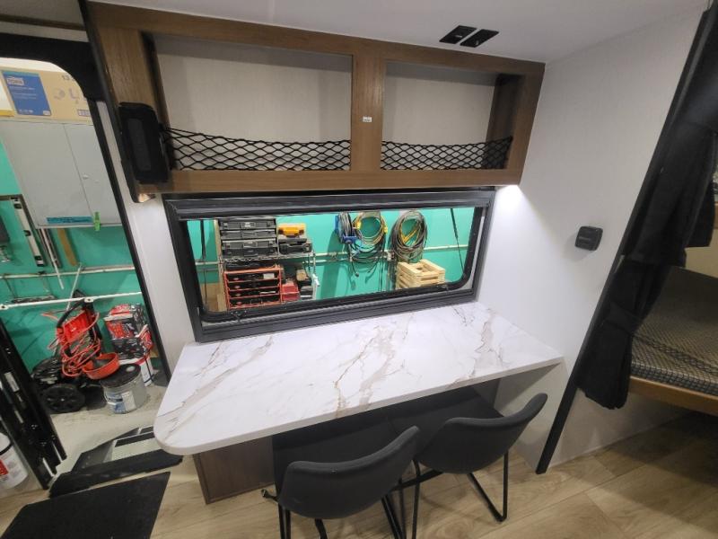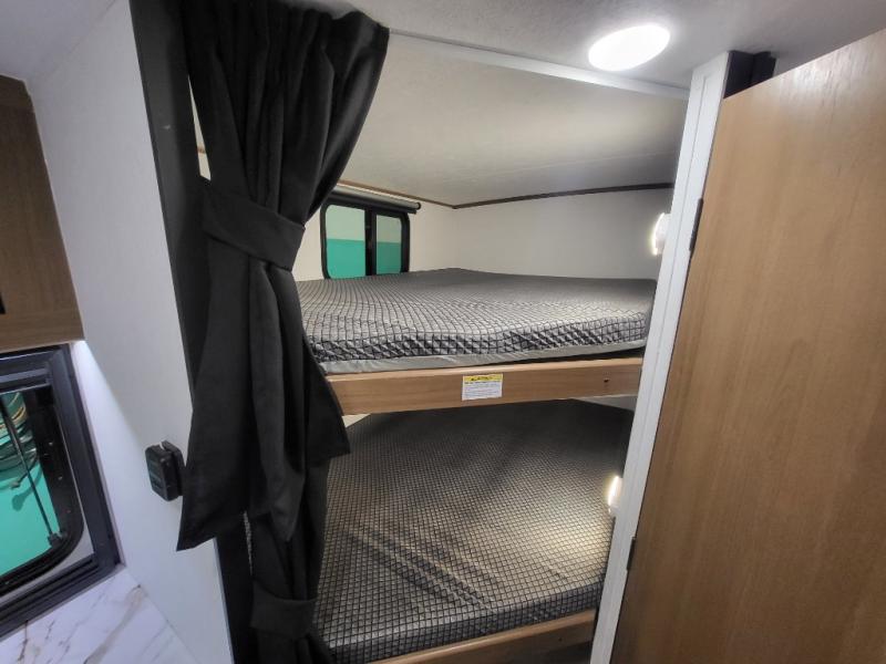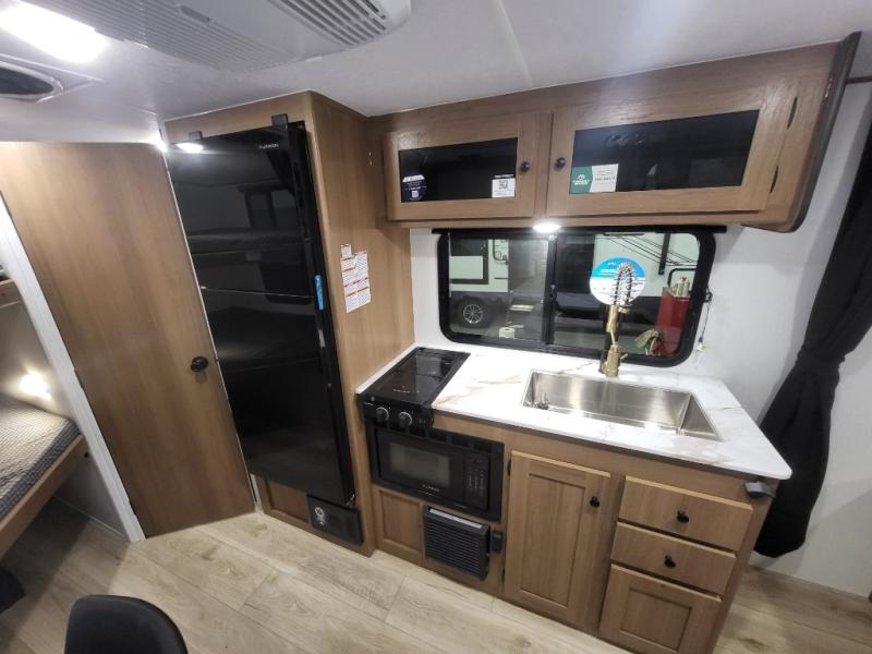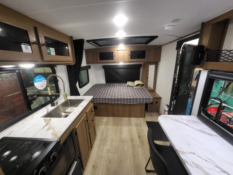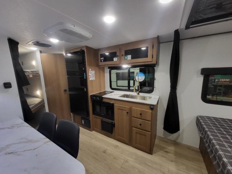 As you step into this versatile travel trailer, you'll be greeted by a front Murphy bed that offers the best of both worlds, a comfortable place to sleep at night and a cozy sofa for daytime lounging. Convenient storage is provided with a wardrobe at the foot of the bed and a nightstand on the other side for your essentials. In the center, the kitchen is fully equipped with a 10-cu. ft. refrigerator, a 2-burner cooktop, and an air fryer microwave, giving you all the tools you need to prepare your favorite meals. Across from the kitchen, a counter with chairs offers a welcoming space to dine, work, or gather. Toward the rear, double bed bunks provide additional sleeping space, with the lower bunk flipping up to reveal extra storage for your gear. Rounding out the layout is a full bathroom in the rear corner, featuring a tub/shower combo so you can enjoy the comfort and convenience of bathing right inside your trailer.