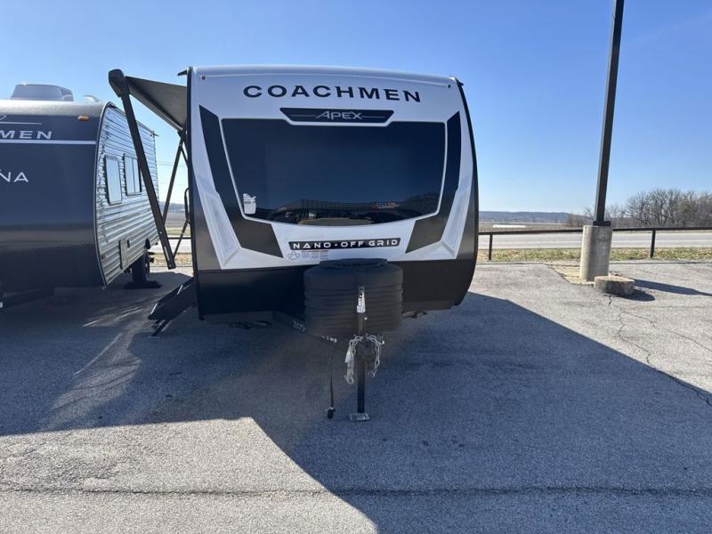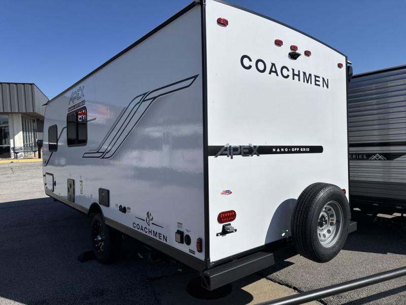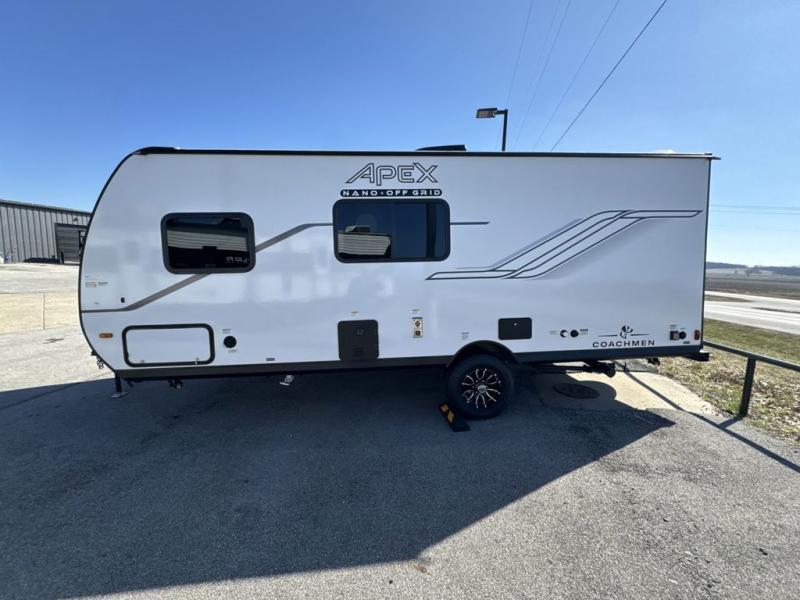 You will find comfort, convenience, and a sturdy construction with each of these Coachmen RV Apex Nano travel trailers! They are held together with an aluma-cage construction, an I-beam chassis, plus vacuum-bonded laminated dual Azdel fiberglass walls for double the protection against the elements. The 400-watt solar panel with a 30-amp control charger is included, along with two 20 lb. LP tanks, a high velocity power roof vent, plus 12V outlets to keep you powered up. More exterior features include a hot/cold shower, four stabilizer jacks, a power awning with LED lighting, and radius thumb latch baggage doors to easily pack and unload your gear. You will love the interior of your Apex Nano with Congoleum residential flooring, one-piece seamless edge countertops, matte black hardware in the galley, and a hand-crafted wood medicine cabinet in the bath.