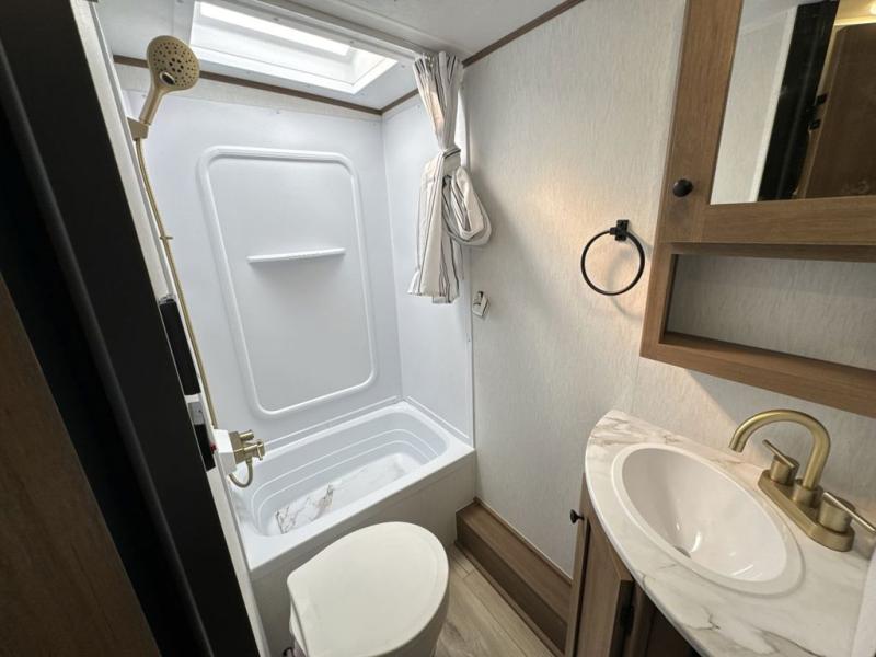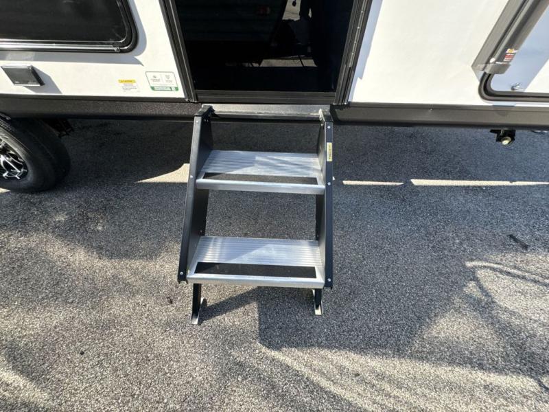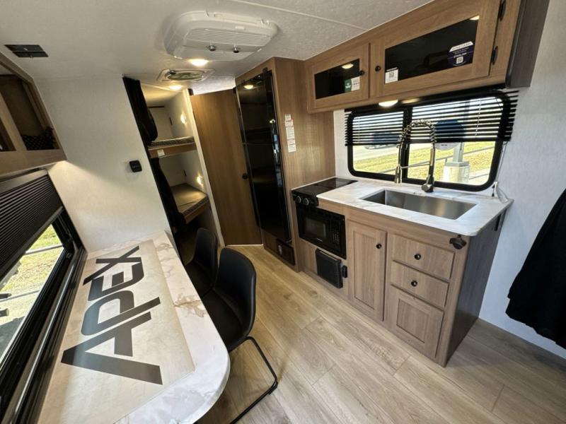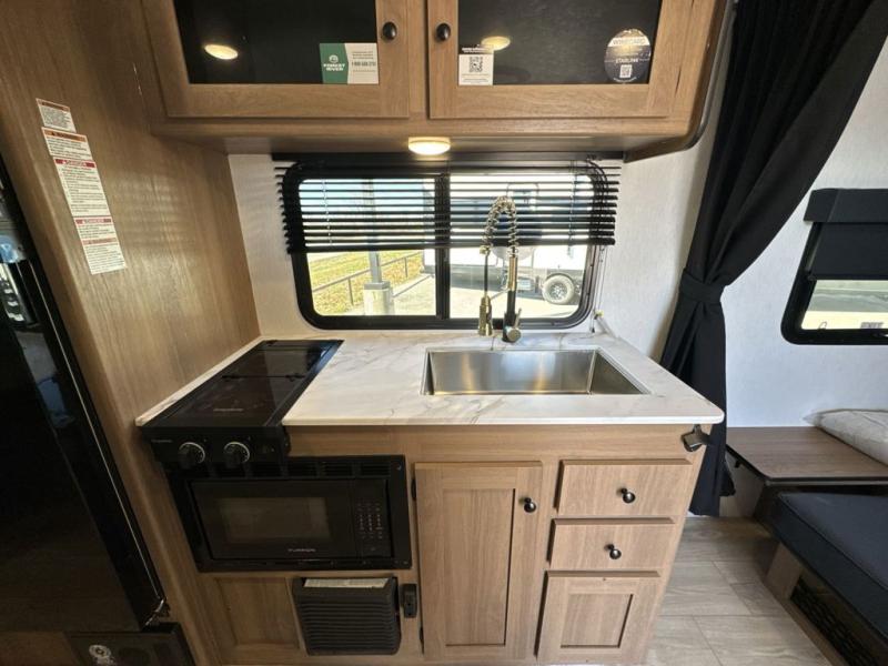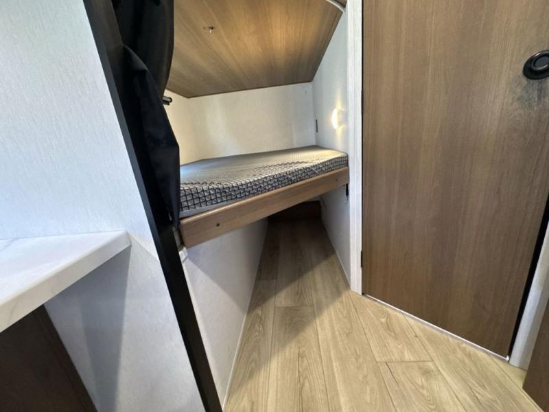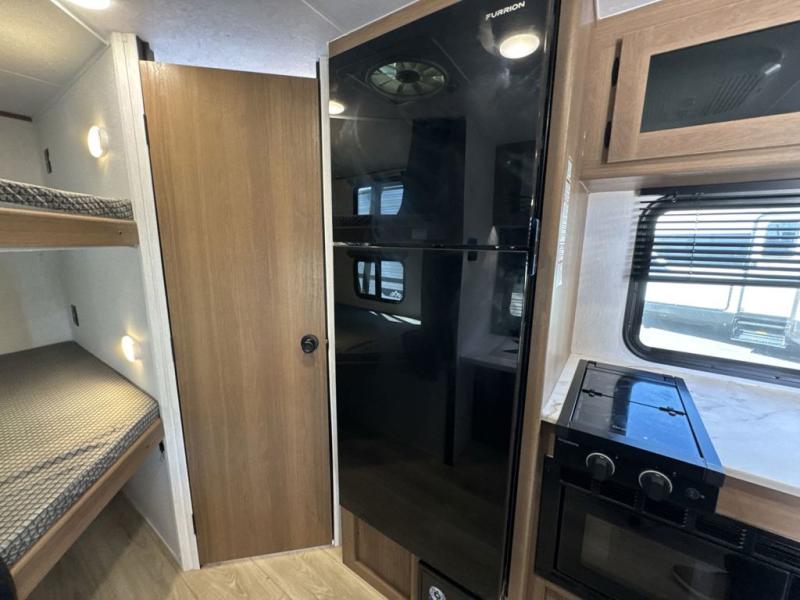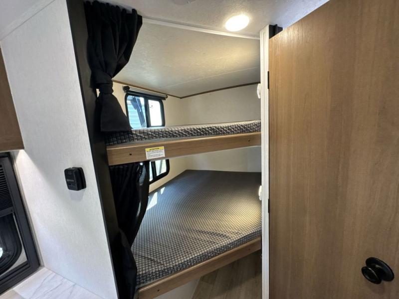 As you step into this versatile travel trailer, you'll be greeted by a front Murphy bed that offers the best of both worlds, a comfortable place to sleep at night and a cozy sofa for daytime lounging. Convenient storage is provided with a wardrobe at the foot of the bed and a nightstand on the other side for your essentials. In the center, the kitchen is fully equipped with a 10-cu. ft. refrigerator, a 2-burner cooktop, and an air fryer microwave, giving you all the tools you need to prepare your favorite meals. Across from the kitchen, a counter with chairs offers a welcoming space to dine, work, or gather. Toward the rear, double bed bunks provide additional sleeping space, with the lower bunk flipping up to reveal extra storage for your gear. Rounding out the layout is a full bathroom in the rear corner, featuring a tub/shower combo so you can enjoy the comfort and convenience of bathing right inside your trailer.