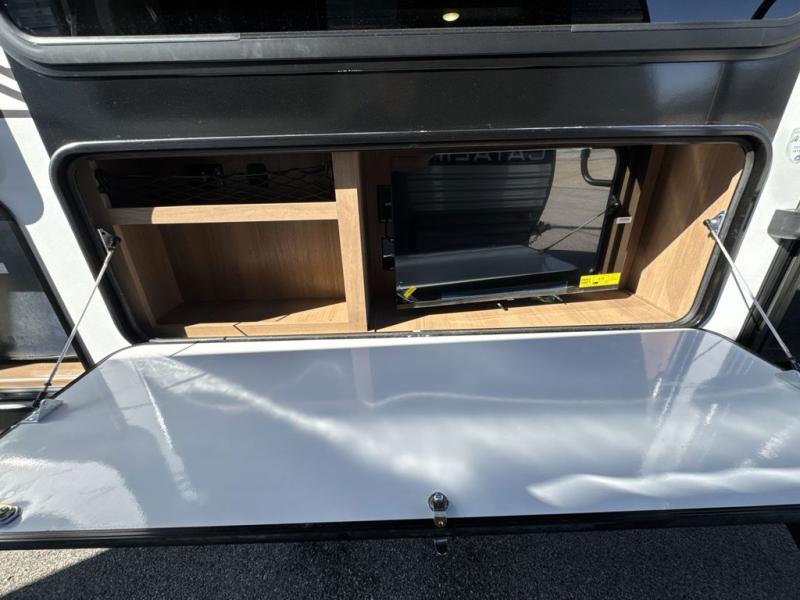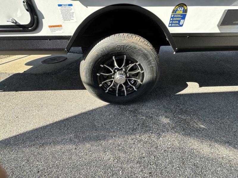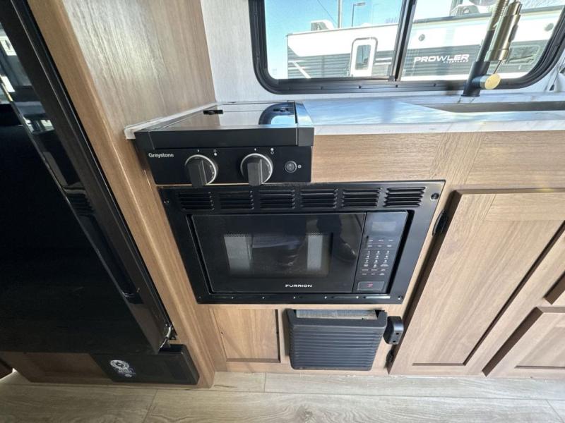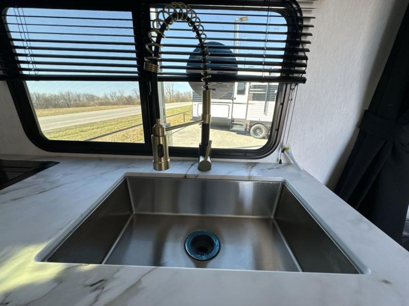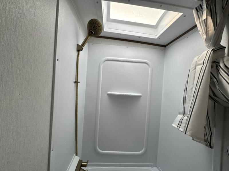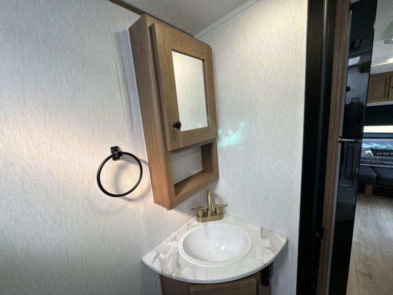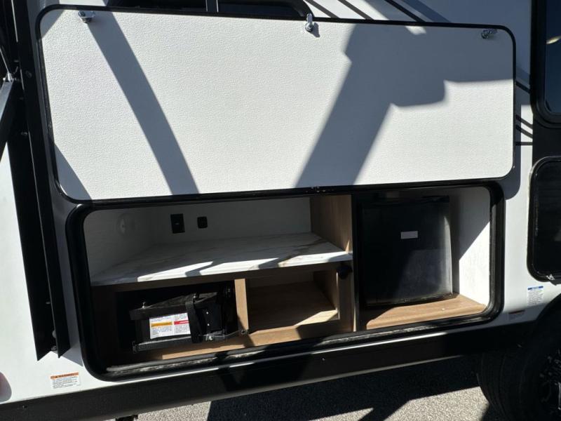 As you step into this versatile travel trailer, you'll be greeted by a front Murphy bed that offers the best of both worlds, a comfortable place to sleep at night and a cozy sofa for daytime lounging. Convenient storage is provided with a wardrobe at the foot of the bed and a nightstand on the other side for your essentials. In the center, the kitchen is fully equipped with a 10-cu. ft. refrigerator, a 2-burner cooktop, and an air fryer microwave, giving you all the tools you need to prepare your favorite meals. Across from the kitchen, a counter with chairs offers a welcoming space to dine, work, or gather. Toward the rear, double bed bunks provide additional sleeping space, with the lower bunk flipping up to reveal extra storage for your gear. Rounding out the layout is a full bathroom in the rear corner, featuring a tub/shower combo so you can enjoy the comfort and convenience of bathing right inside your trailer.