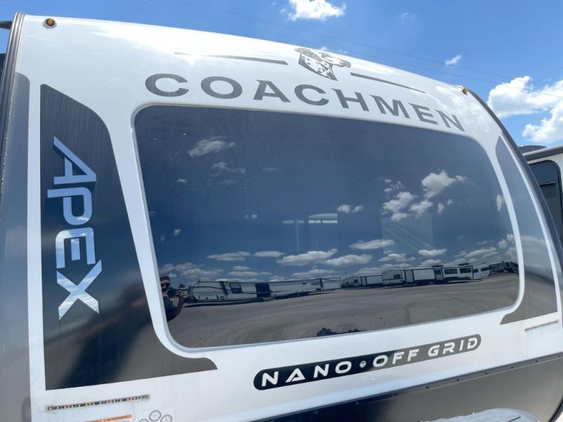 You will find comfort, convenience, and a sturdy construction with each of these Coachmen RV Apex Nano travel trailers! They are held together with an aluma-cage construction, an I-beam chassis, plus vacuum-bonded laminated dual Azdel fiberglass walls for double the protection against the elements. The 200-watt solar panel with a 30 amp control charger is included within the Off-Grid Package, along with two 20 lb. LP tanks, a high velocity power roof vent, plus 12V outlets to keep you powered up. More exterior feature include a hot/cold shower, four stabilizer jacks, a power awning with LED lighting, and magnetic baggage door catches to easily pack and unload your gear. You will love the interior of your Apex Nano with Congoleum residential flooring, one-piece seamless edge countertops, matte black hardware in the galley, and a hand-crafted wood medicine cabinet in the bath.