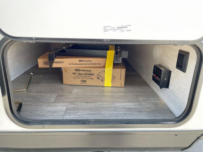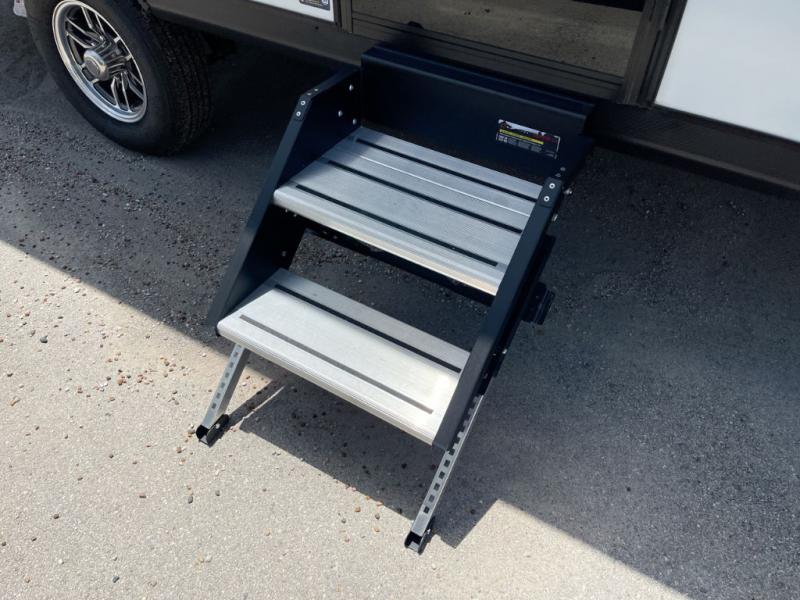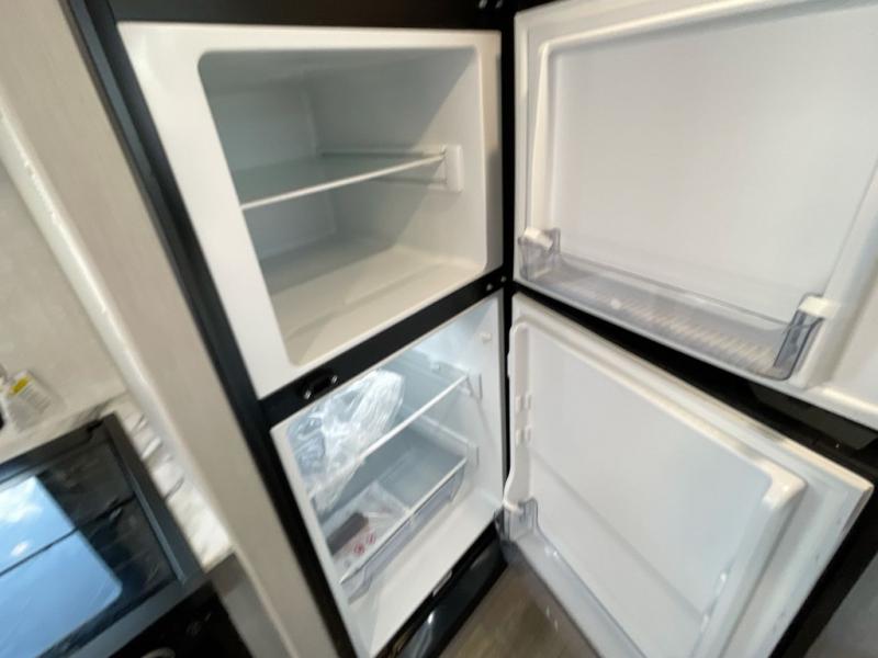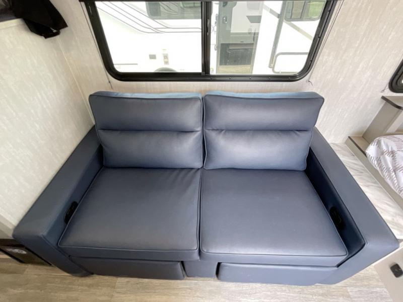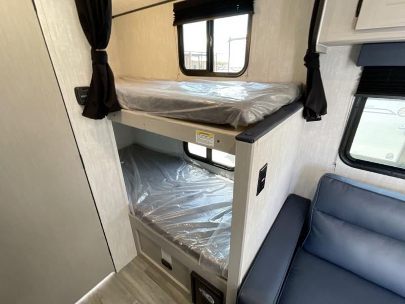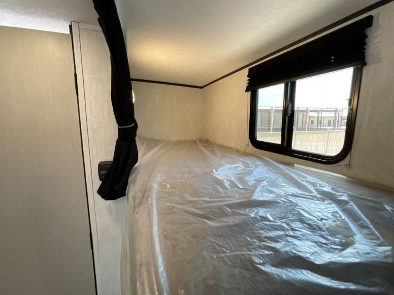 There's a comfortable place for everyone to sleep in this travel trailer with a front 54" x 80" bed and set of 30" x 70" bunk beds! The sofa can even transform into an extra sleeping space for a guest! Enjoy a meal prepared with the two burner cooktop, microwave, and 8 cu. ft. 12V refrigerator, then head outdoors to sit under the 12' power awning. The rear corner bathroom has a tub/shower for you to start your mornings feeling clean and fresh, plus a medicine cabinet to keep your toiletries close. You will have plenty of room to store your outdoor gear between the front exterior pass-through storage area and the rear exterior storage area!
