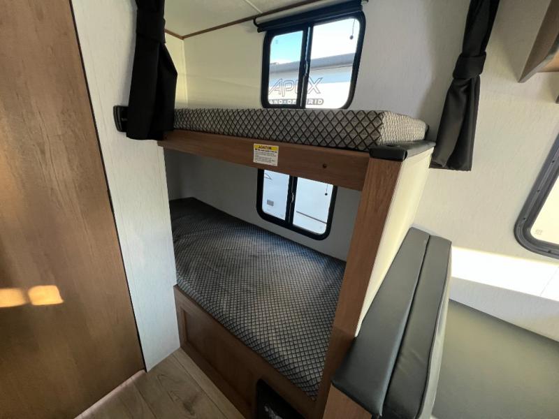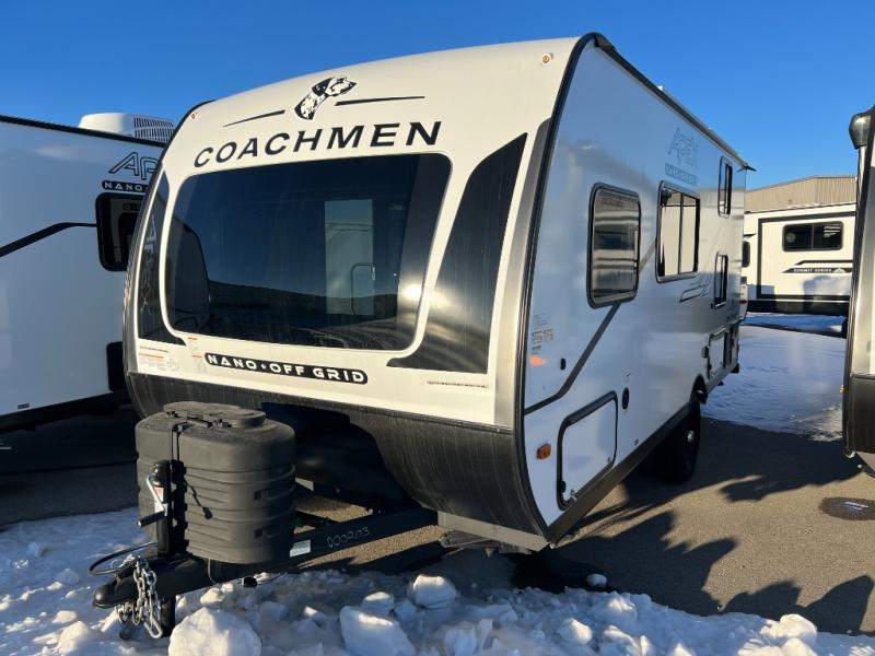 You will find comfort, convenience, and a sturdy construction with each of these Coachmen RV Apex Nano travel trailers! They are held together with an aluma-cage construction, an I-beam chassis, plus vacuum-bonded laminated dual Azdel fiberglass walls for double the protection against the elements. The 400-watt solar panel with a 30-amp control charger is included, along with two 20 lb. LP tanks, a high velocity power roof vent, plus 12V outlets to keep you powered up. More exterior features include a hot/cold shower, four stabilizer jacks, a power awning with LED lighting, and radius thumb latch baggage doors to easily pack and unload your gear. You will love the interior of your Apex Nano with Congoleum residential flooring, one-piece seamless edge countertops, matte black hardware in the galley, and a hand-crafted wood medicine cabinet in the bath.