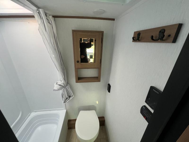 There's a comfortable place for everyone to sleep in this travel trailer with a front 54" x 80" bed and set of 30" x 74" bunk beds! The booth dinette can even transform into an extra-sleeping space when you're not using it to enjoy a meal prepared with the two-burner cooktop, microwave, and 8 cu. ft. 12V refrigerator. The rear corner bathroom has a tub/shower for you to start your mornings feeling clean and fresh, plus a medicine cabinet to keep your toiletries close. You will have plenty of room to store your outdoor gear between the front exterior pass-through storage area and the rear exterior storage area!