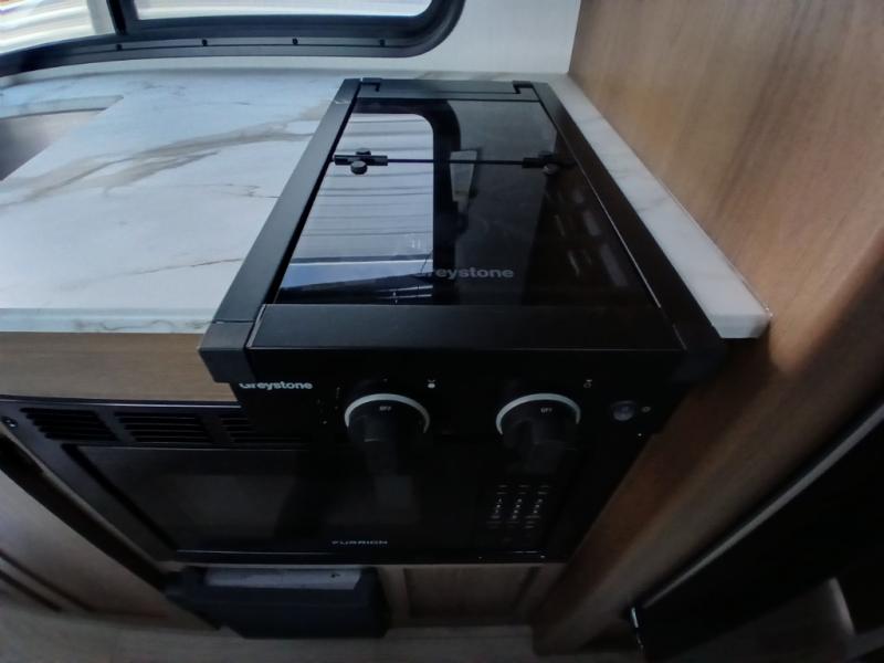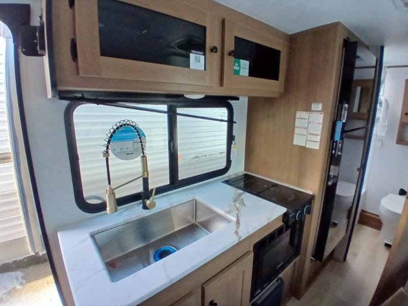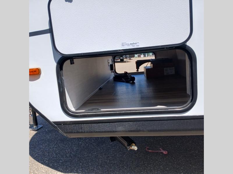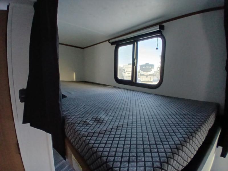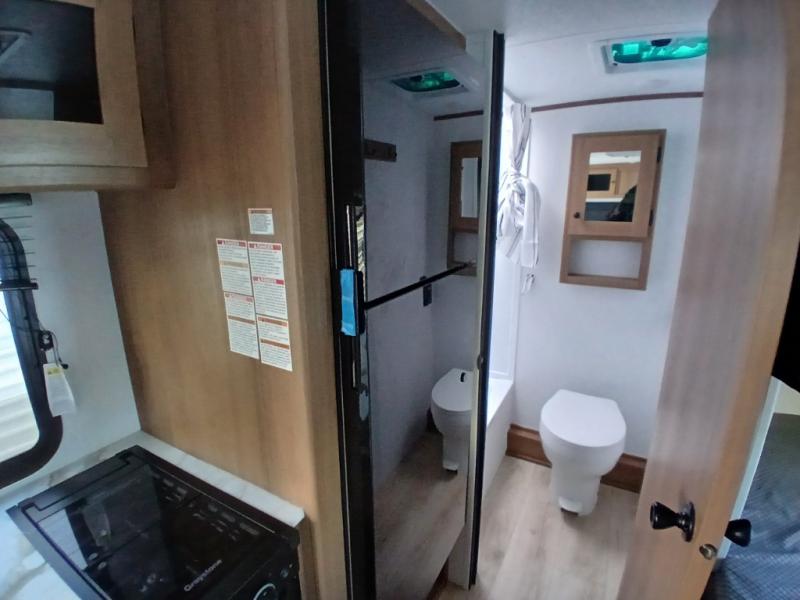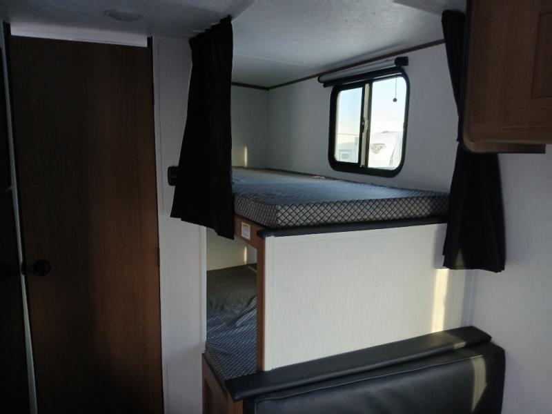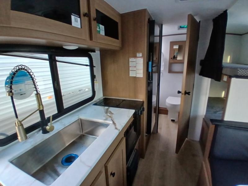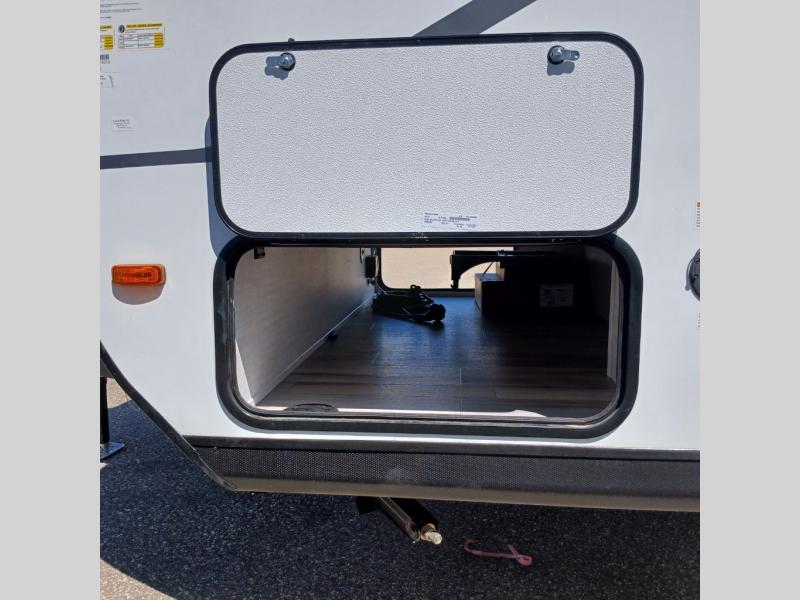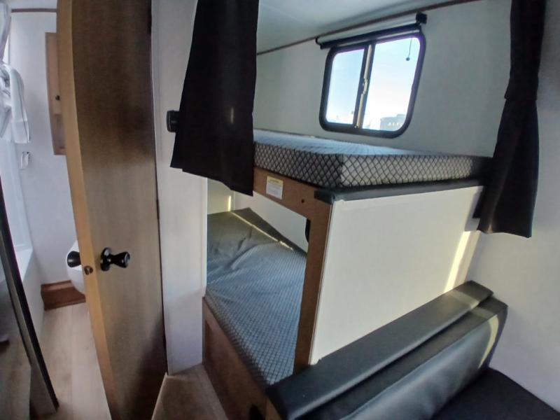 There's a comfortable place for everyone to sleep in this travel trailer with a front 54" x 80" bed and set of 30" x 74" bunk beds! The booth dinette can even transform into an extra-sleeping space when you're not using it to enjoy a meal prepared with the two-burner cooktop, microwave, and 8 cu. ft. 12V refrigerator. The rear corner bathroom has a tub/shower for you to start your mornings feeling clean and fresh, plus a medicine cabinet to keep your toiletries close. You will have plenty of room to store your outdoor gear between the front exterior pass-through storage area and the rear exterior storage area!