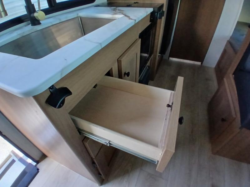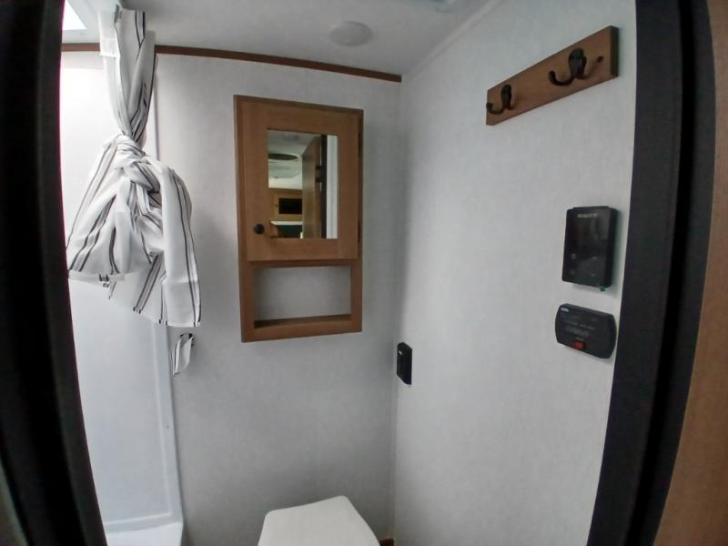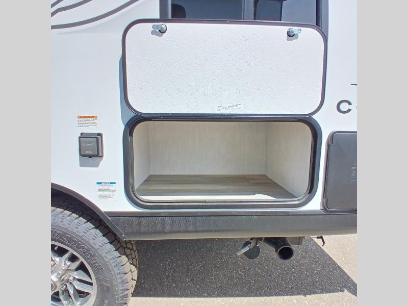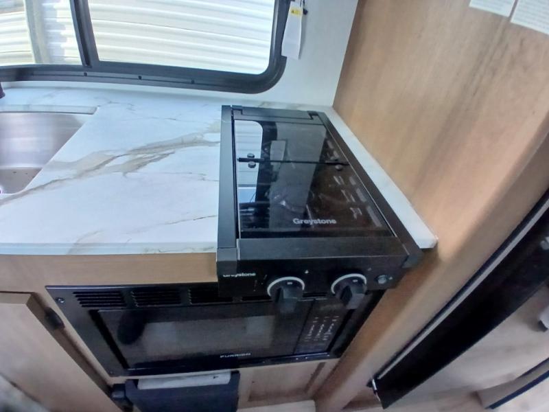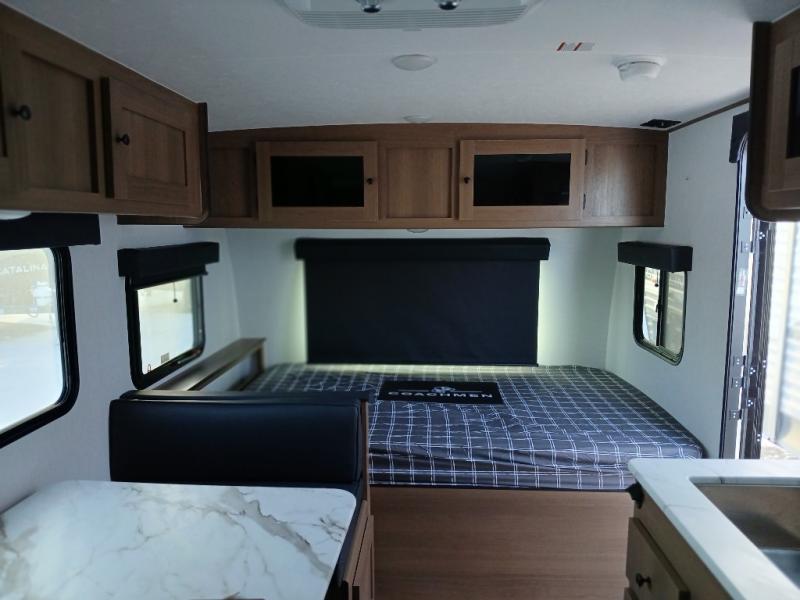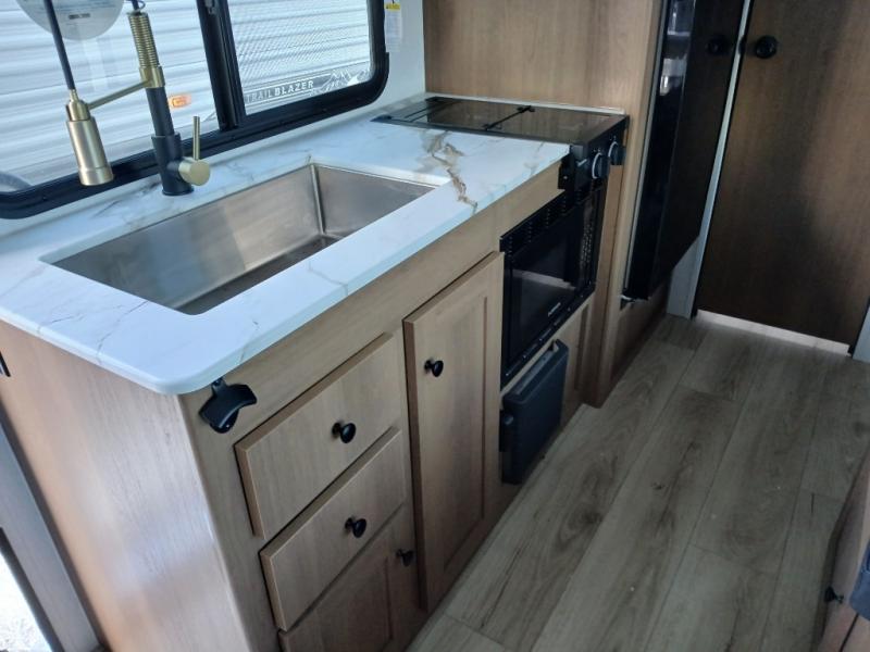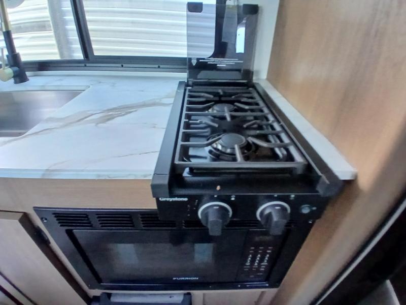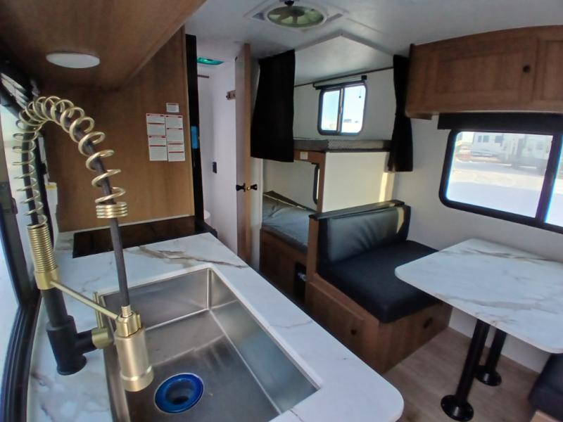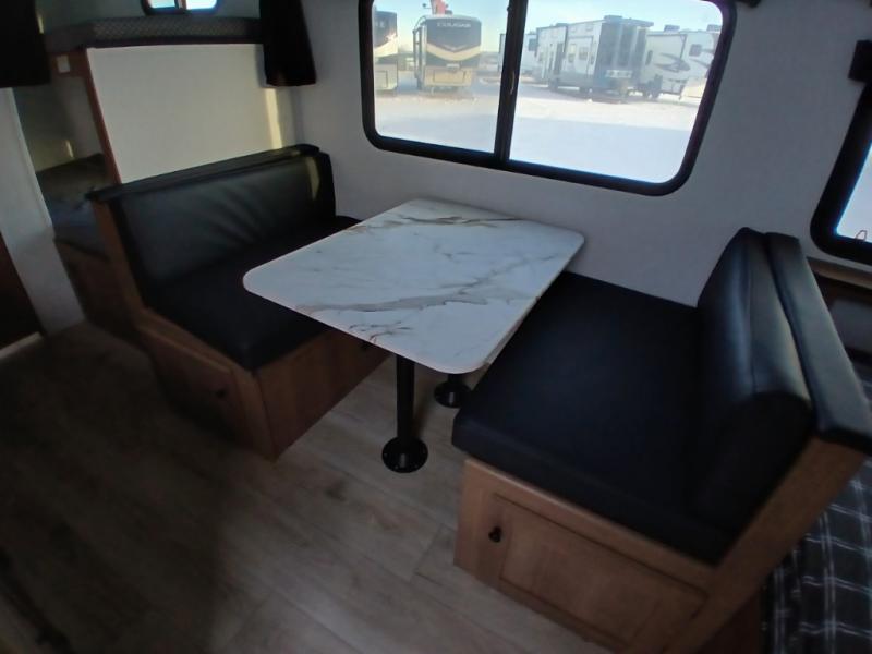 There's a comfortable place for everyone to sleep in this travel trailer with a front 54" x 80" bed and set of 30" x 74" bunk beds! The booth dinette can even transform into an extra-sleeping space when you're not using it to enjoy a meal prepared with the two-burner cooktop, microwave, and 8 cu. ft. 12V refrigerator. The rear corner bathroom has a tub/shower for you to start your mornings feeling clean and fresh, plus a medicine cabinet to keep your toiletries close. You will have plenty of room to store your outdoor gear between the front exterior pass-through storage area and the rear exterior storage area!