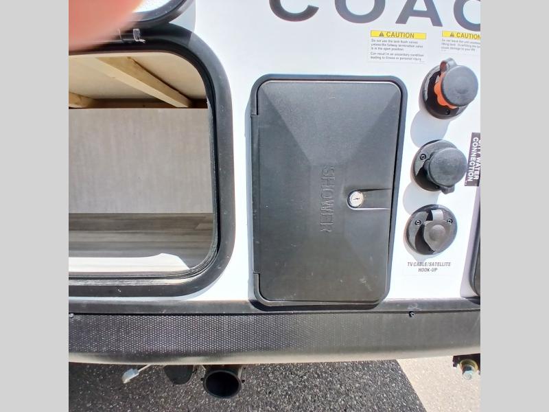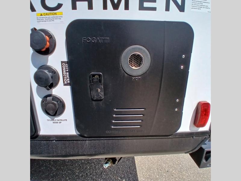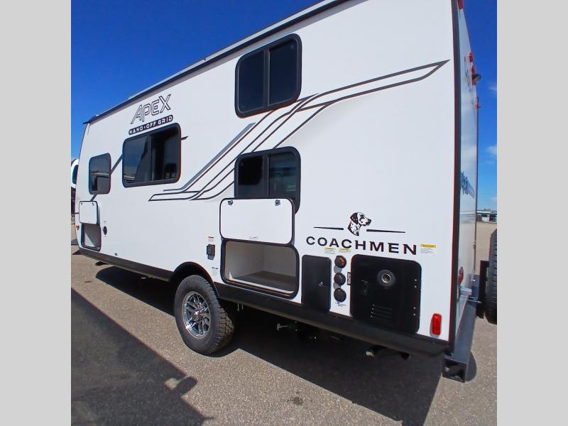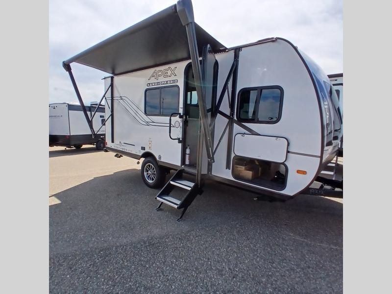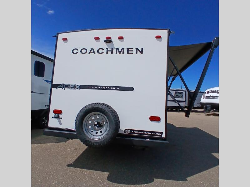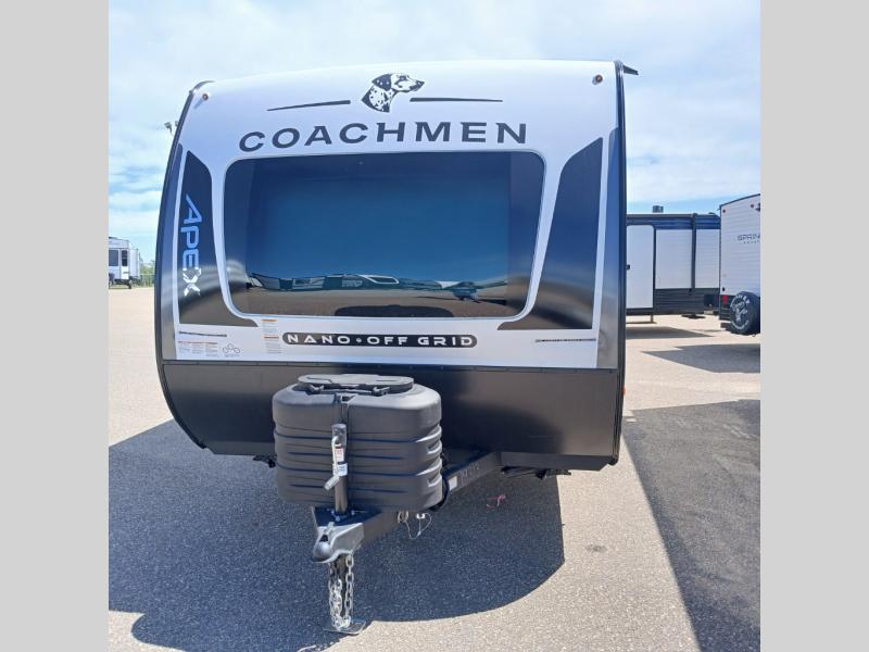 You will find comfort, convenience, and a sturdy construction with each of these Coachmen RV Apex Nano travel trailers! They are held together with an aluma-cage construction, an I-beam chassis, plus vacuum-bonded laminated dual Azdel fiberglass walls for double the protection against the elements. The 400-watt solar panel with a 30-amp control charger is included, along with two 20 lb. LP tanks, a high velocity power roof vent, plus 12V outlets to keep you powered up. More exterior features include a hot/cold shower, four stabilizer jacks, a power awning with LED lighting, and radius thumb latch baggage doors to easily pack and unload your gear. You will love the interior of your Apex Nano with Congoleum residential flooring, one-piece seamless edge countertops, matte black hardware in the galley, and a hand-crafted wood medicine cabinet in the bath.