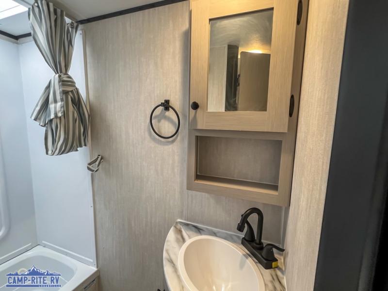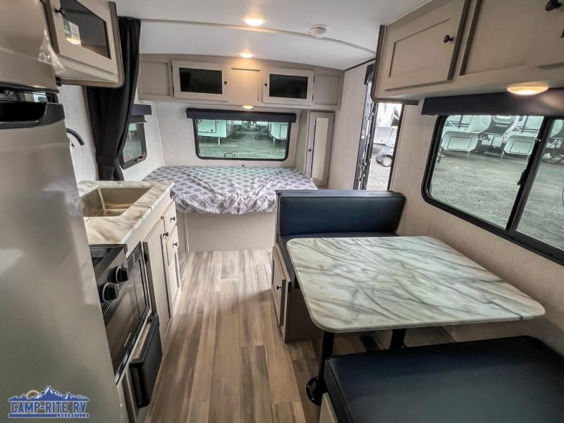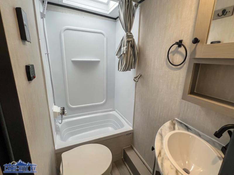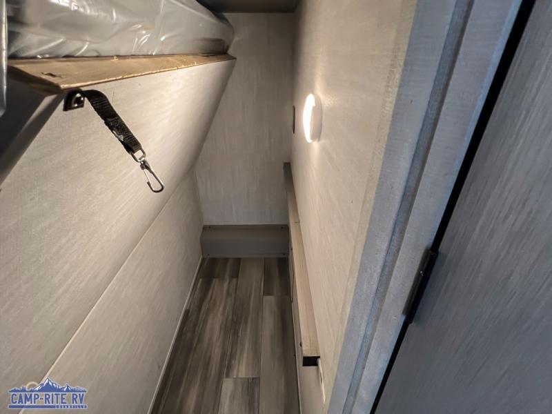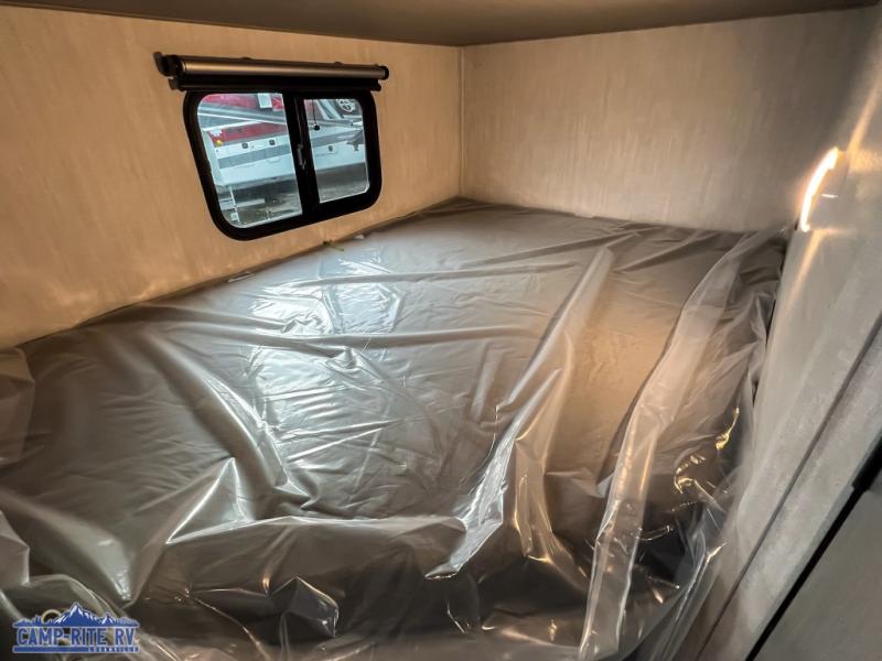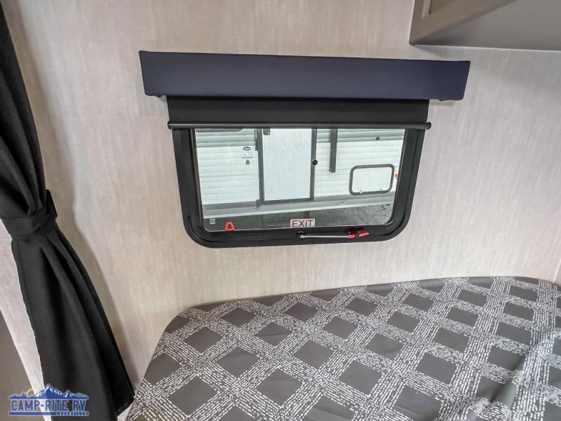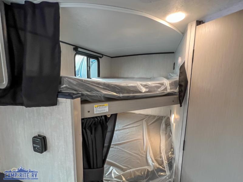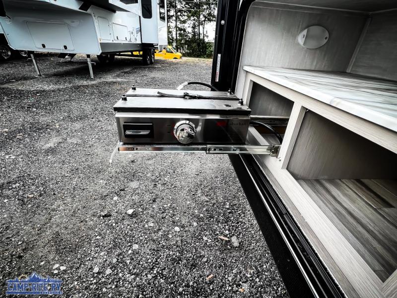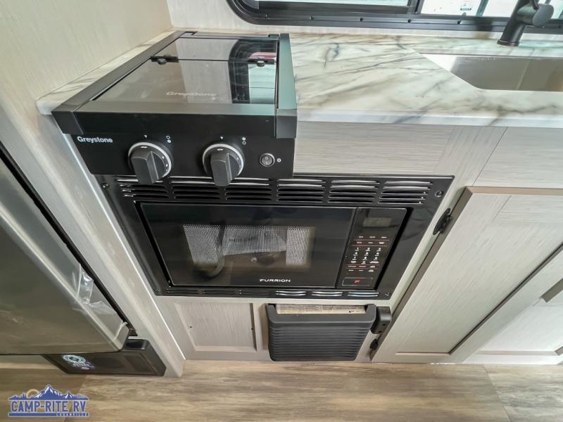 This travel trailer offers versatility with a front fixed bed or optional Murphy bed depending on your needs. There is a rear corner double bed bunk above a lower flip up double bed and a booth dinette that can transform into an extra sleeping space when you're not using it to enjoy a meal or play a card game. Everyone can stay clean with tub/shower in the rear corner bathroom and keep their bellies full with the two burner cooktop and 8 cu. ft. 12V refrigerator. You can even cook outdoors with the exterior camp kitchen while staying protected by the power awning with LED lighting!