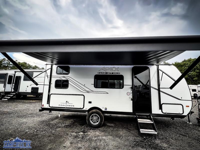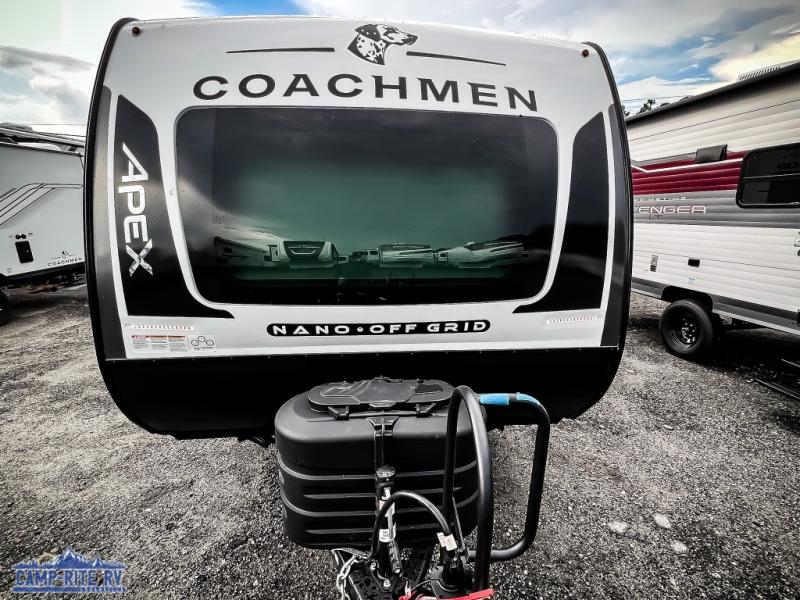 You will find comfort, convenience, and a sturdy construction with each of these Coachmen RV Apex Nano travel trailers! They are held together with an aluma-cage construction, an I-beam chassis, plus vacuum-bonded laminated dual Azdel fiberglass walls for double the protection against the elements. The 200-watt solar panel with a 30 amp control charger is included within the Off-Grid Package, along with two 20 lb. LP tanks, a high velocity power roof vent, plus 12V outlets to keep you powered up. More exterior feature include a hot/cold shower, four stabilizer jacks, a power awning with LED lighting, and magnetic baggage door catches to easily pack and unload your gear. You will love the interior of your Apex Nano with Congoleum residential flooring, one-piece seamless edge countertops, matte black hardware in the galley, and a hand-crafted wood medicine cabinet in the bath.