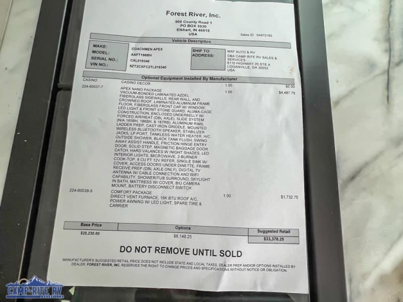 Coachmen RV Apex Nano travel trailer 186BH highlights:
