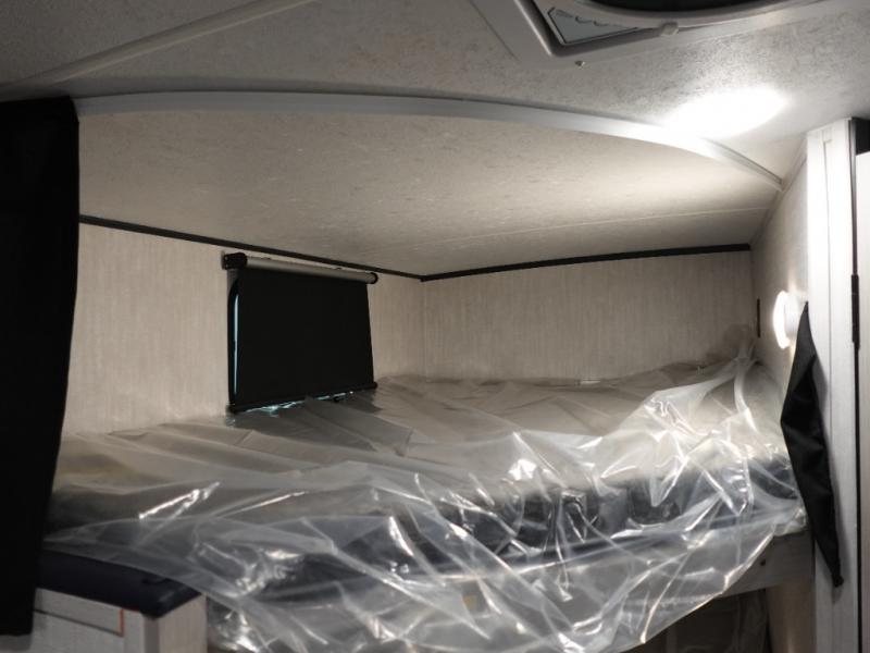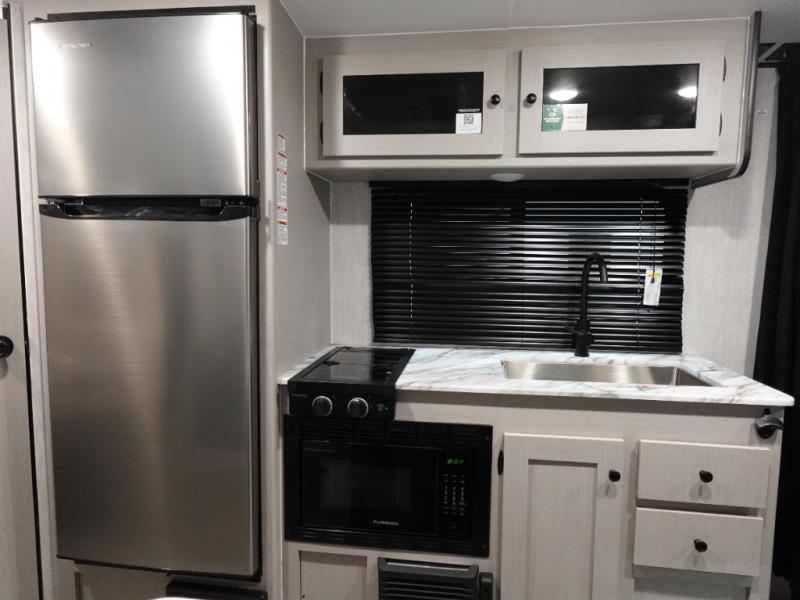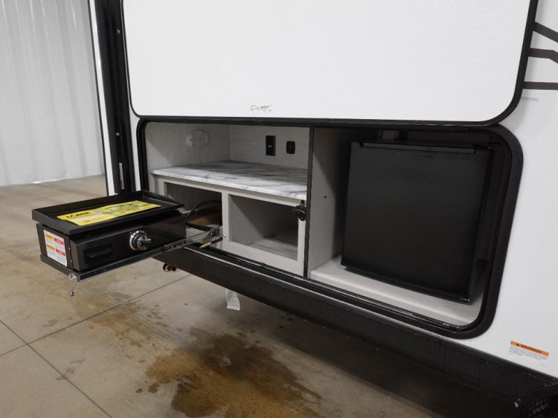 This travel trailer offers versatility with a front fixed bed or optional Murphy bed depending on your needs. There is a rear corner double bed bunk above a lower flip up double bed and a booth dinette that can transform into an extra sleeping space when you're not using it to enjoy a meal or play a card game. Everyone can stay clean with tub/shower in the rear corner bathroom and keep their bellies full with the two burner cooktop and 8 cu. ft. 12V refrigerator. You can even cook outdoors with the exterior camp kitchen while staying protected by the power awning with LED lighting!