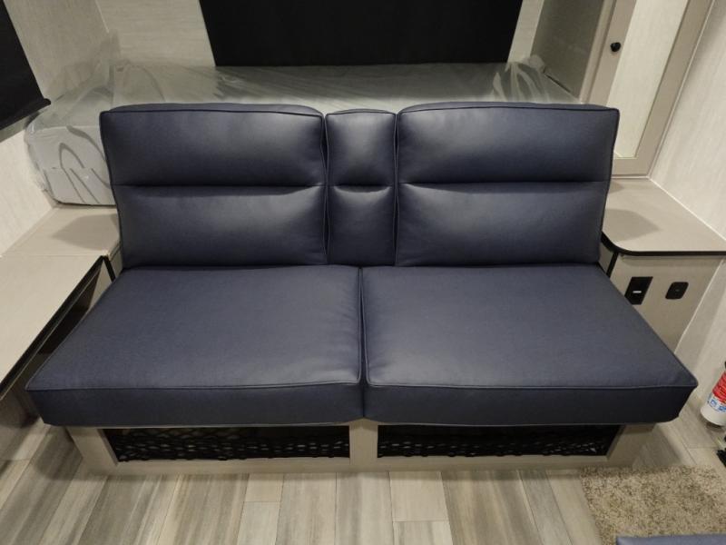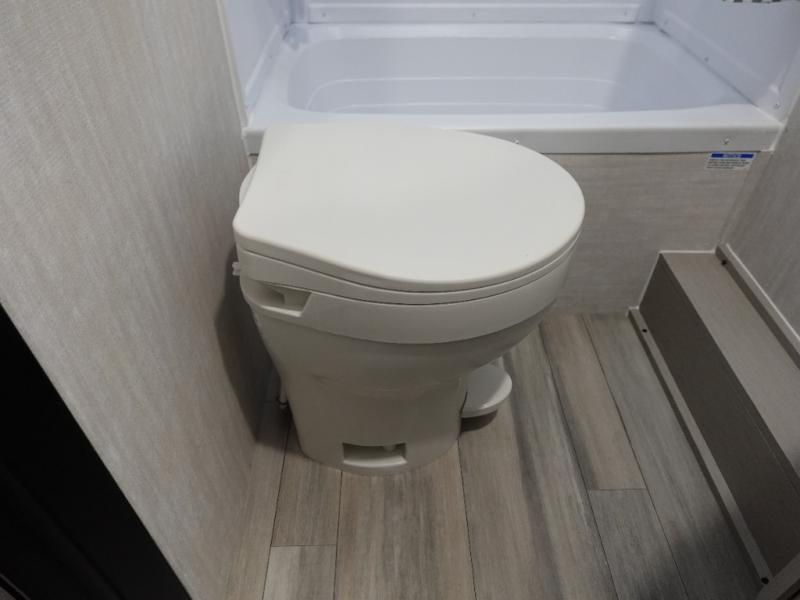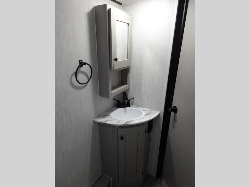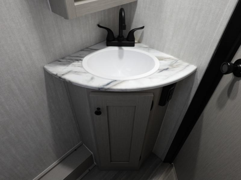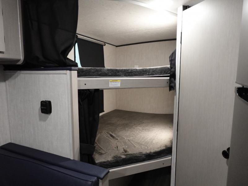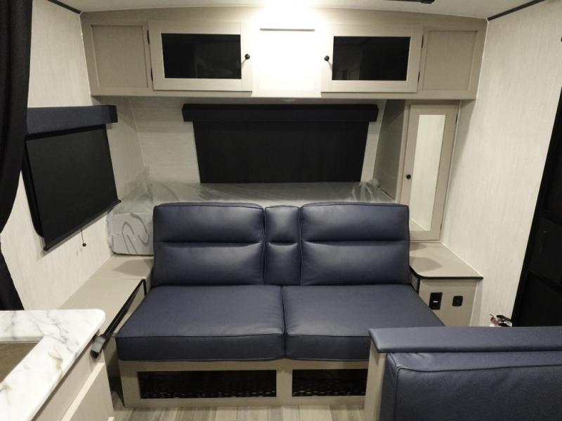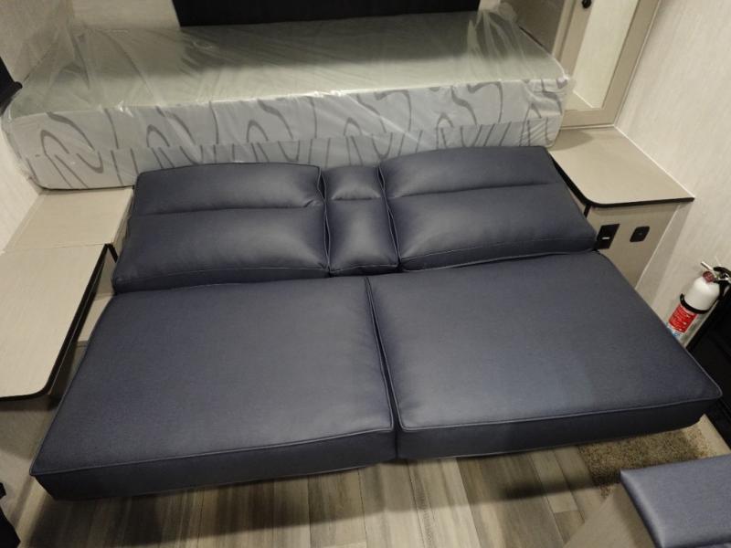 This travel trailer offers versatility with a front fixed bed or optional Murphy bed depending on your needs. There is a rear corner double bed bunk above a lower flip up double bed and a booth dinette that can transform into an extra sleeping space when you're not using it to enjoy a meal or play a card game. Everyone can stay clean with tub/shower in the rear corner bathroom and keep their bellies full with the two burner cooktop and 8 cu. ft. 12V refrigerator. You can even cook outdoors with the exterior camp kitchen while staying protected by the power awning with LED lighting!