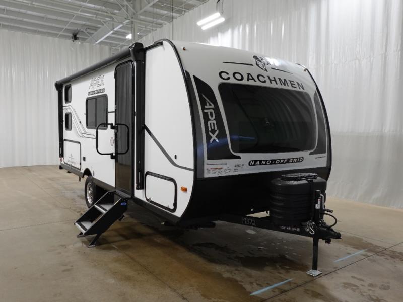 You will find comfort, convenience, and a sturdy construction with each of these Coachmen RV Apex Nano travel trailers! They are held together with an aluma-cage construction, an I-beam chassis, plus vacuum-bonded laminated dual Azdel fiberglass walls for double the protection against the elements. The 200-watt solar panel with a 30 amp control charger is included within the Off-Grid Package, along with two 20 lb. LP tanks, a high velocity power roof vent, plus 12V outlets to keep you powered up. More exterior feature include a hot/cold shower, four stabilizer jacks, a power awning with LED lighting, and magnetic baggage door catches to easily pack and unload your gear. You will love the interior of your Apex Nano with Congoleum residential flooring, one-piece seamless edge countertops, matte black hardware in the galley, and a hand-crafted wood medicine cabinet in the bath.