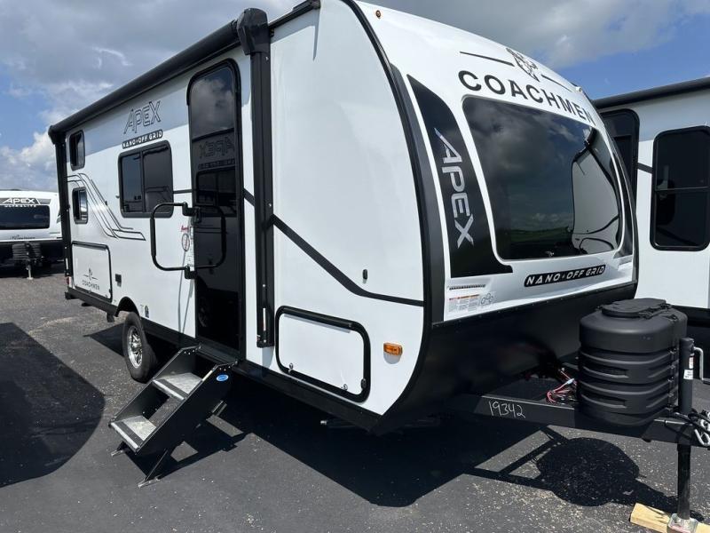 You will find comfort, convenience, and a sturdy construction with each of these Coachmen RV Apex Nano travel trailers! They are held together with an aluma-cage construction, an I-beam chassis, plus vacuum-bonded laminated dual Azdel fiberglass walls for double the protection against the elements. The 200-watt solar panel with a 30 amp control charger is included within the Off-Grid Package, along with two 20 lb. LP tanks, a high velocity power roof vent, plus 12V outlets to keep you powered up. More exterior feature include a hot/cold shower, four stabilizer jacks, a power awning with LED lighting, and magnetic baggage door catches to easily pack and unload your gear. You will love the interior of your Apex Nano with Congoleum residential flooring, one-piece seamless edge countertops, matte black hardware in the galley, and a hand-crafted wood medicine cabinet in the bath.