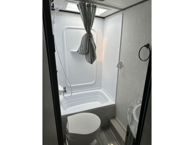 This travel trailer offers versatility with a front fixed bed or optional Murphy bed depending on your needs. There is a rear corner double bed bunk above a lower flip up double bed and a booth dinette that can transform into an extra sleeping space when you're not using it to enjoy a meal or play a card game. Everyone can stay clean with tub/shower in the rear corner bathroom and keep their bellies full with the two burner cooktop and 8 cu. ft. 12V refrigerator. You can even cook outdoors with the exterior camp kitchen while staying protected by the power awning with LED lighting!