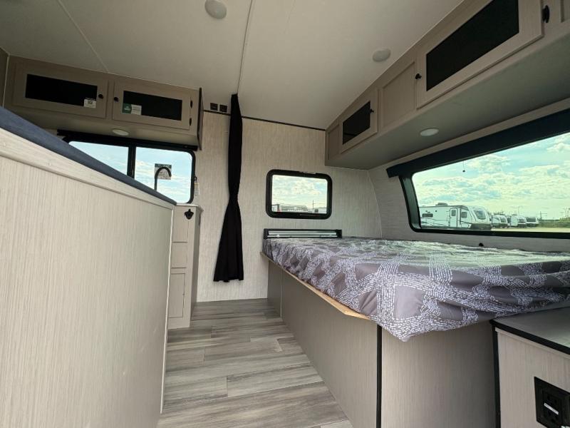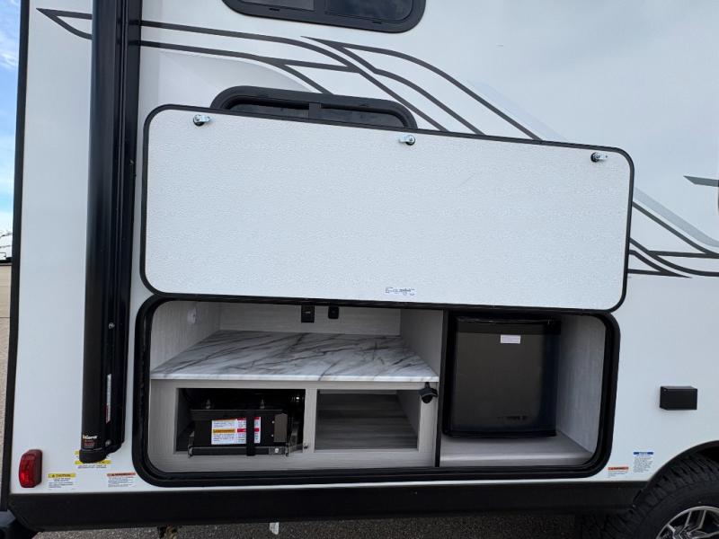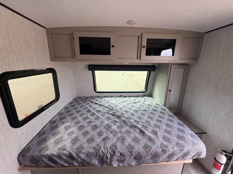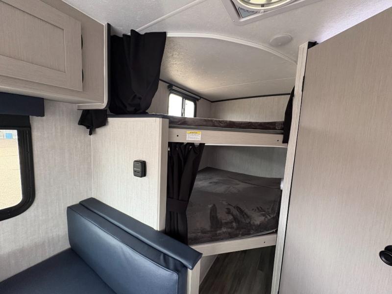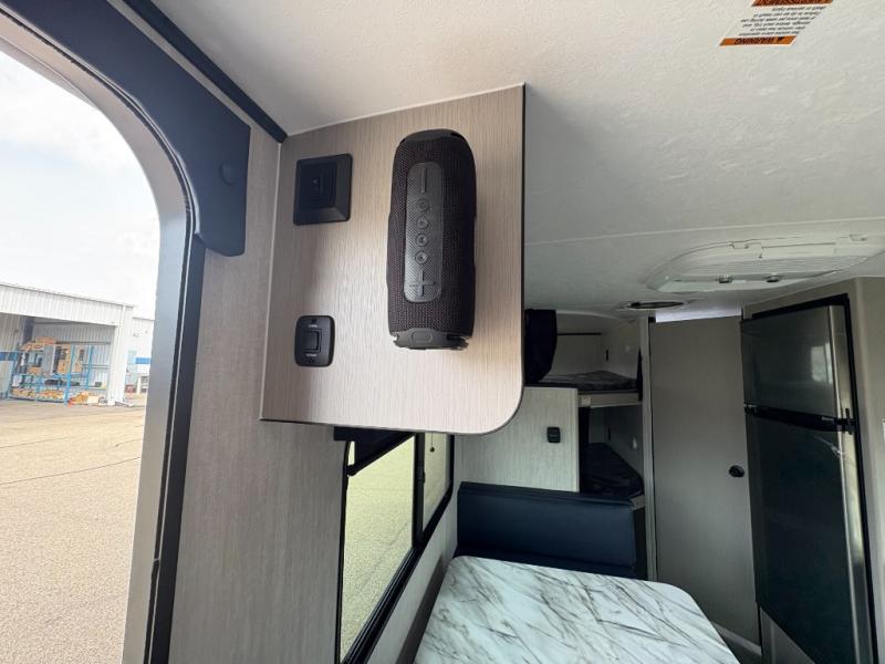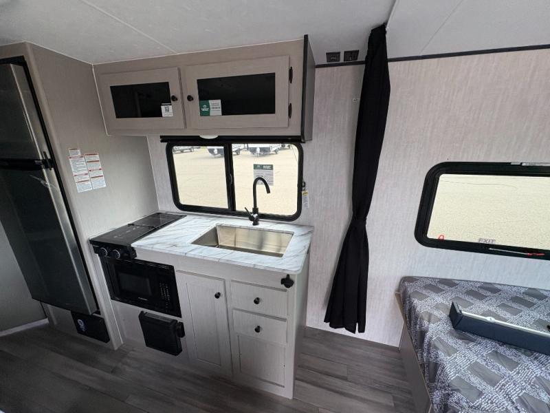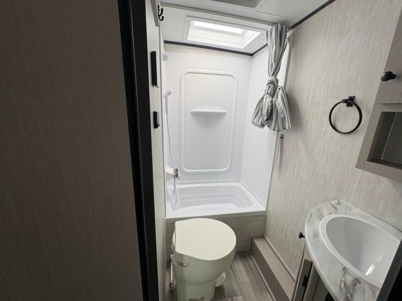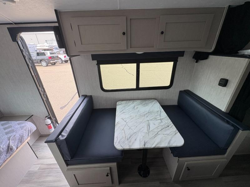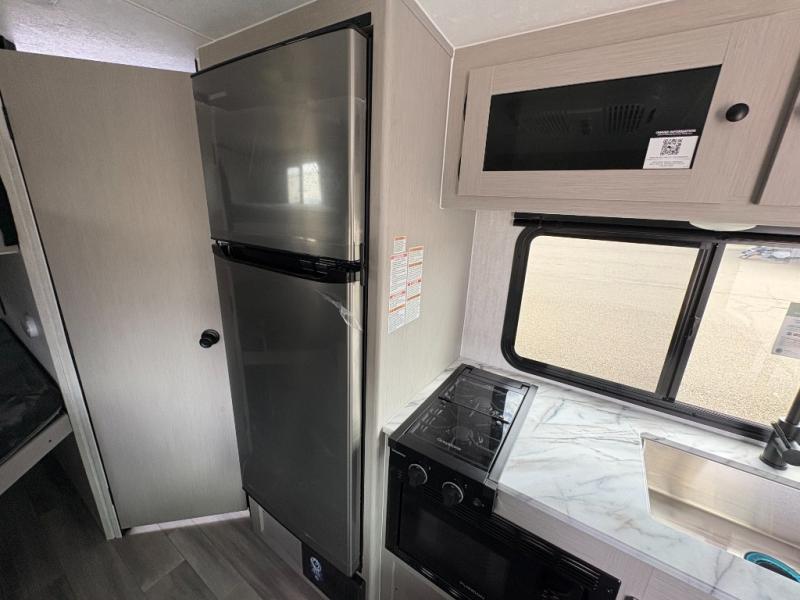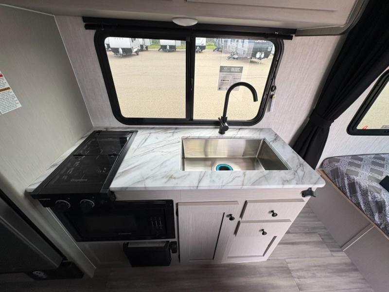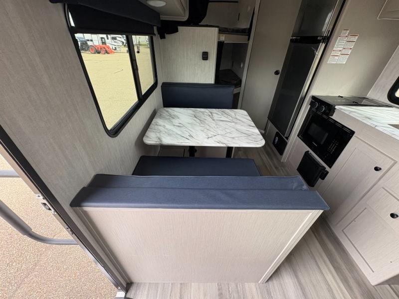 This travel trailer offers versatility with a front fixed bed or optional Murphy bed depending on your needs. There is a rear corner double bed bunk above a lower flip up double bed and a booth dinette that can transform into an extra sleeping space when you're not using it to enjoy a meal or play a card game. Everyone can stay clean with tub/shower in the rear corner bathroom and keep their bellies full with the two burner cooktop and 8 cu. ft. 12V refrigerator. You can even cook outdoors with the exterior camp kitchen while staying protected by the power awning with LED lighting!